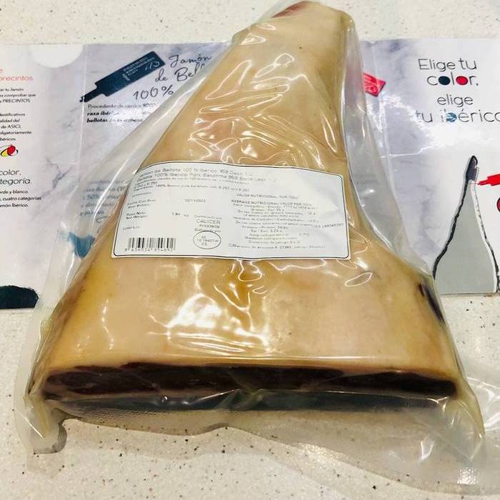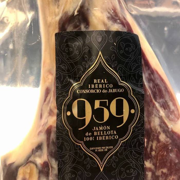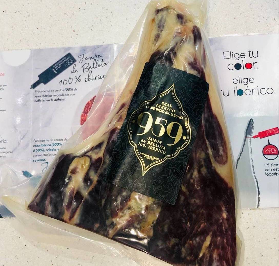 Media pieza de un jamón de Bellota 100% ibérico entero deshuesado, cortado por la mitad, y envasado al vacío, de la marca 959 de Consorcio de Jabugo.