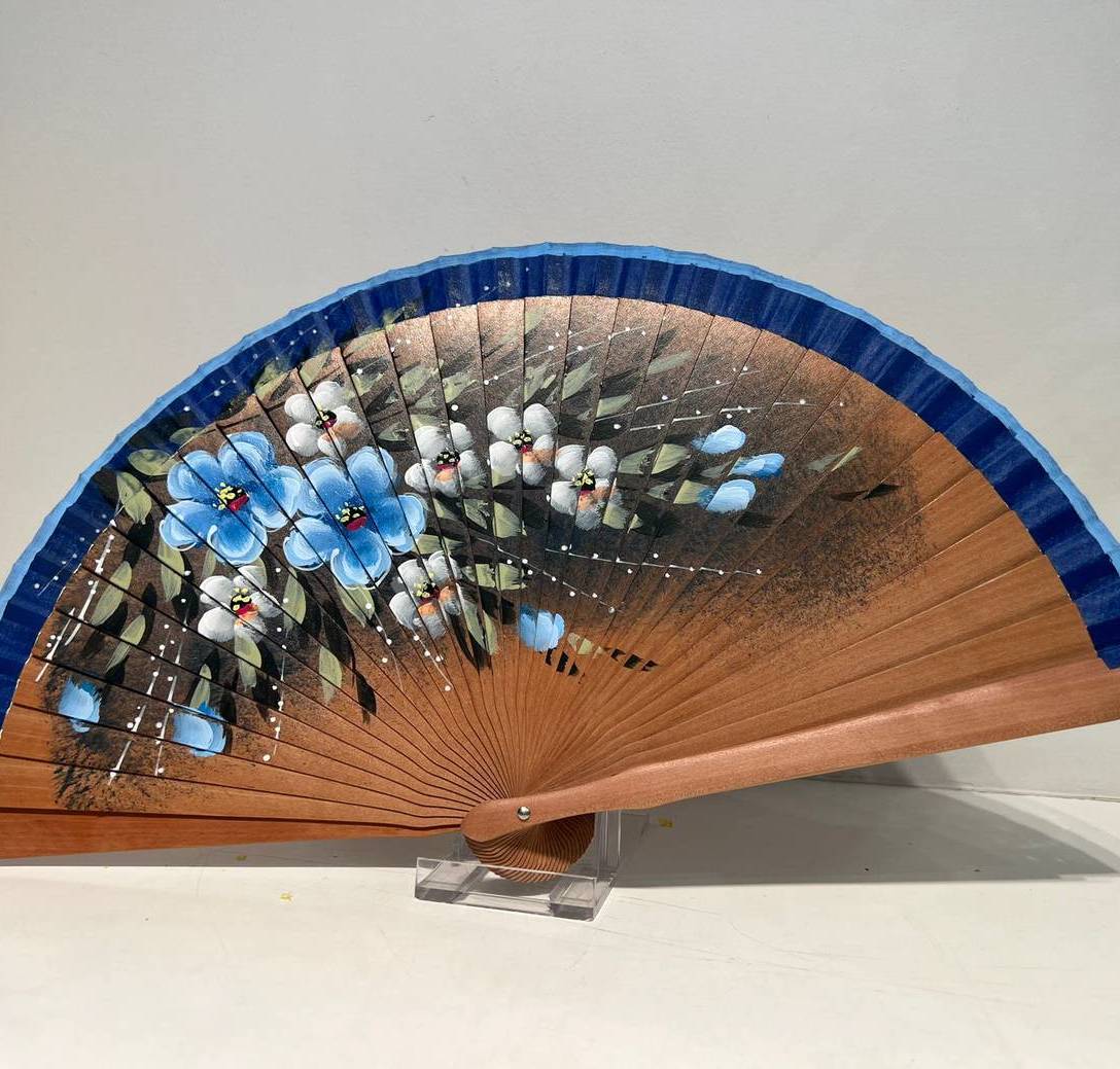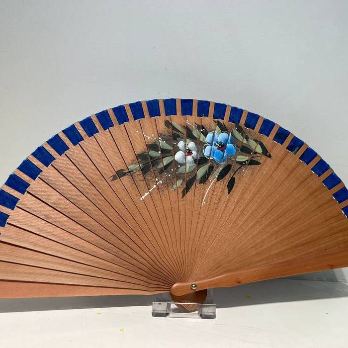 Abanico pequeño de 21 cm de madera de abedul, color marrón. Con flores pintadas a mano por las dos caras. Ideal para el bolso.