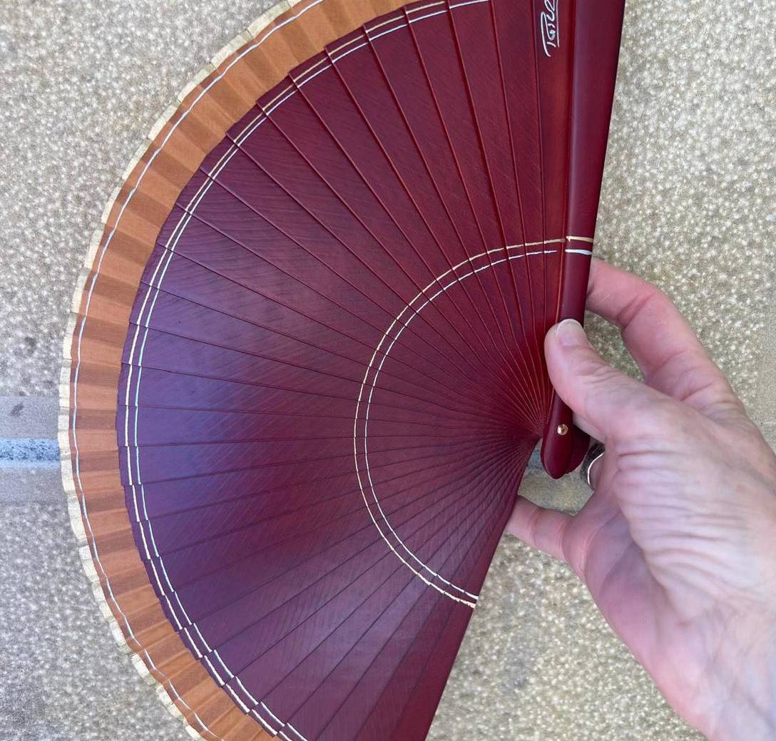 Abanico pequeño de 19 cm de madera de sapeli de color caoba, con una estrecha tela de color beige con un adorno pintado a mano en dorado y plata. Gracias a su tamaño es un abanico ligero, fácil de usar, cómodo para llevar en el bolso, incluso en un bolsillo. La madera de sapeli es una madera flexible, ligera y bonita, que hace que al abrir el abanico tenga un sonido perfecto.