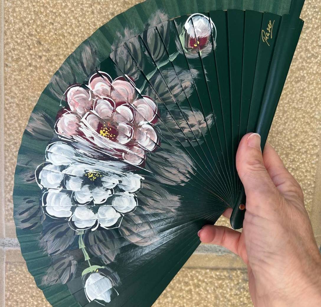 Abanico pequeño de 19 cm de madera de sapeli de color verde oscuro, con una estrecha tela verde oscura con decoración floral pintada a mano. Gracias a su tamaño es un abanico ligero, fácil de usar, cómodo para llevar en el bolso, incluso en un bolsillo. La madera de sapeli es una madera flexible, ligera y bonita, que hace que al abrir el abanico tenga un sonido perfecto.