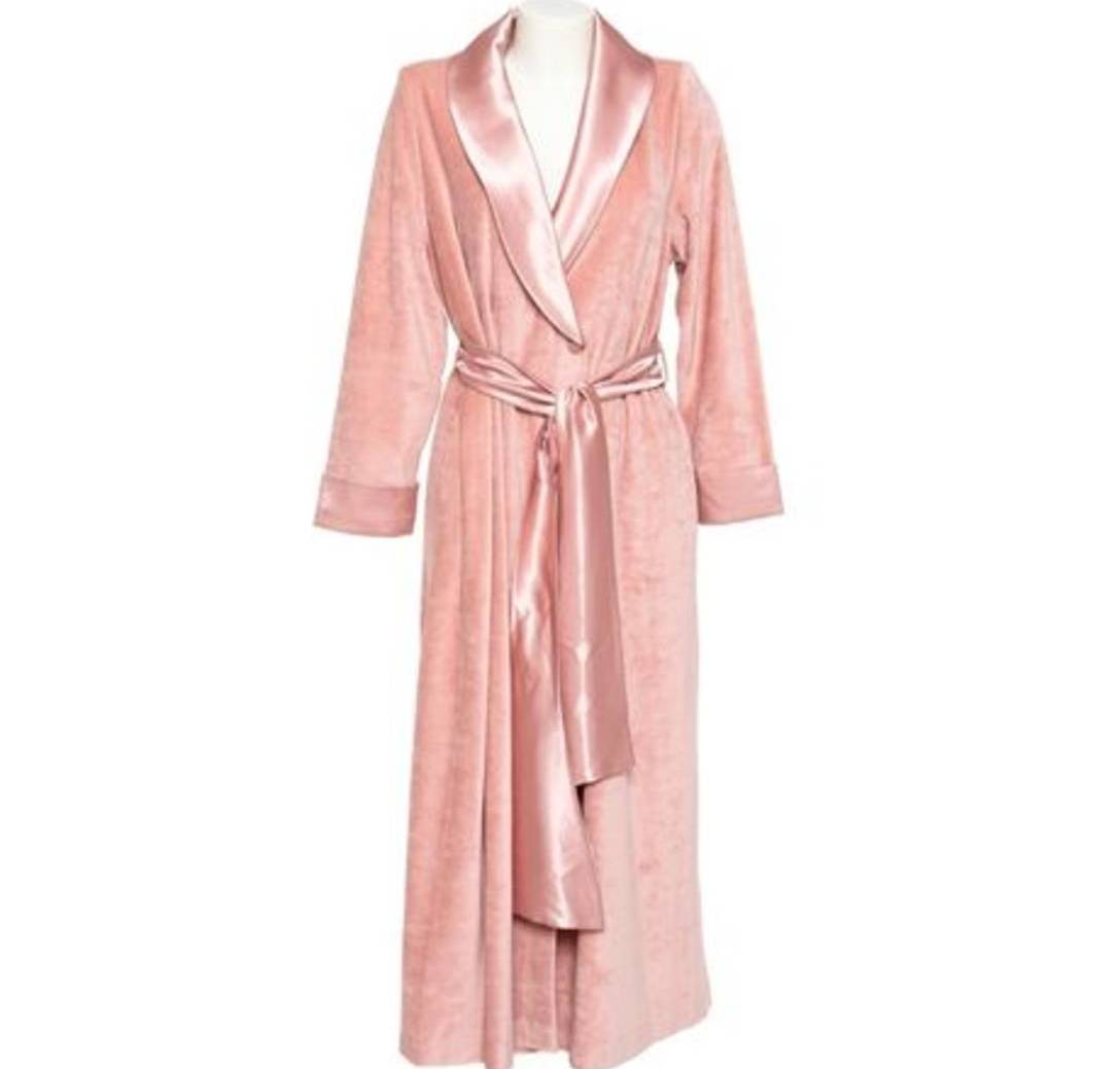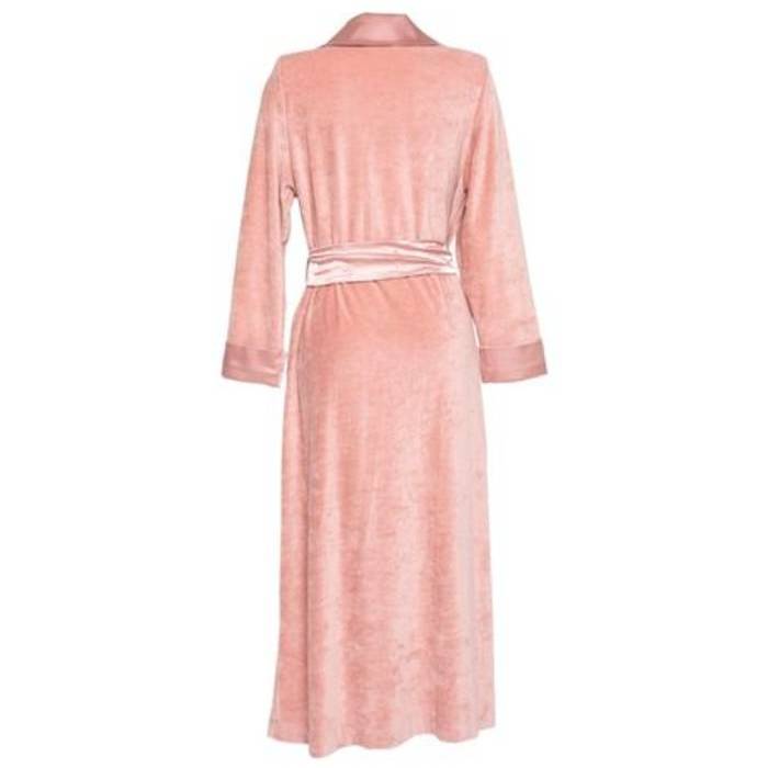 Bata larga de terciopelo cruzada con lazada, cuello y puño suave en raso al tono. Brinda un aspecto elegante y una maravillosa sensación de suavidad en la piel.