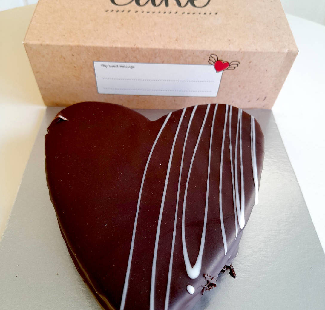 Tarta con forma de corazón de estilo sacher (bizcocho de chocolate con fina capa de mermelada de fresa y recubierta de chocolate). Para dos personas. ideal para regalar o celebrar en san Valentín.