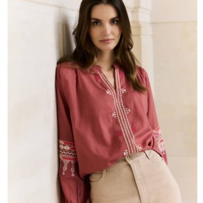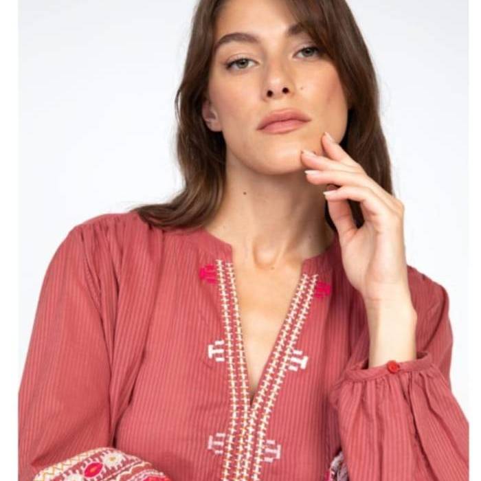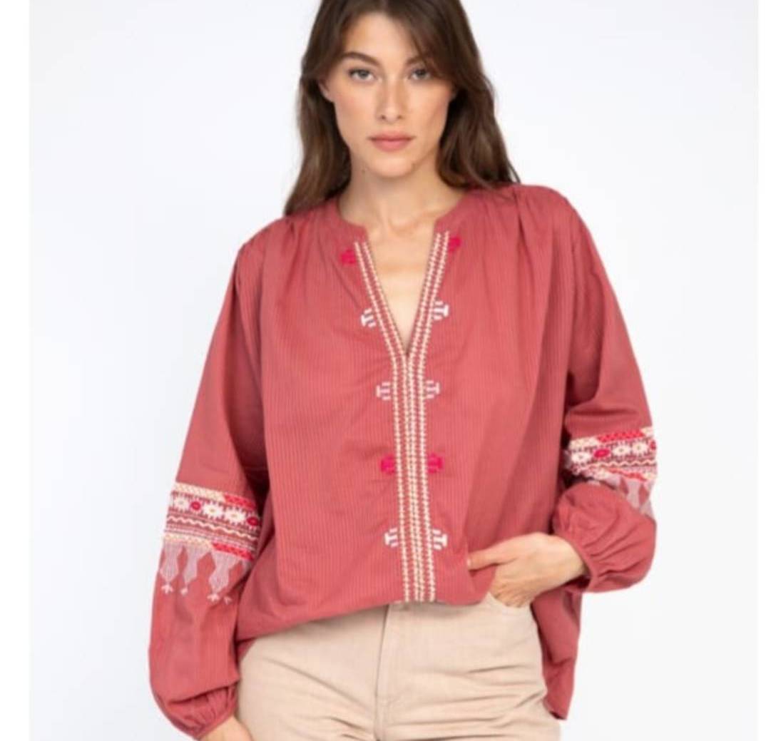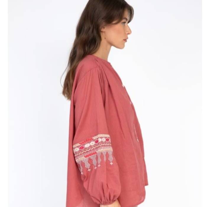 Blusa bordada de estilo Boho , manga larga abullonada . Cuello mao con escote en V . Bordados central y mangas . Algodón .