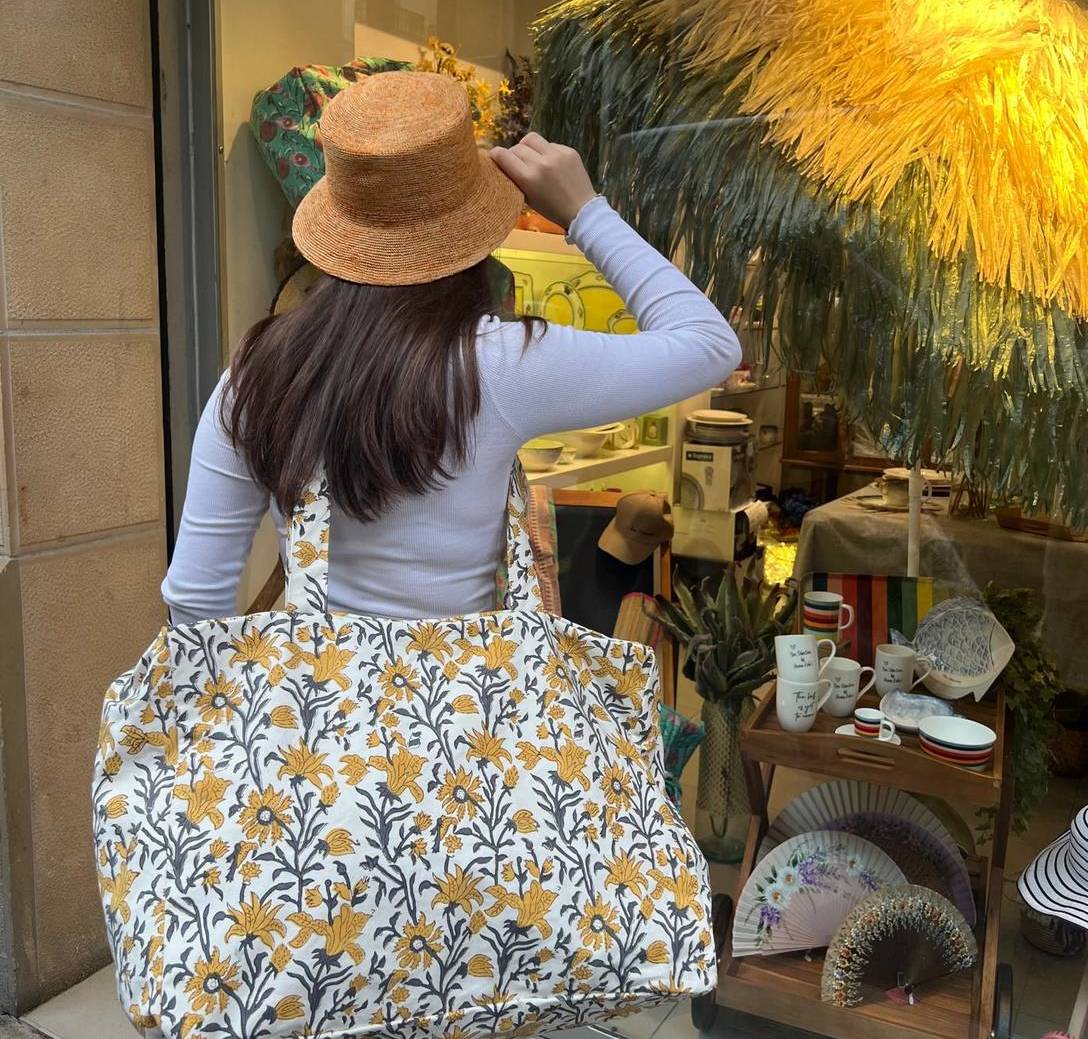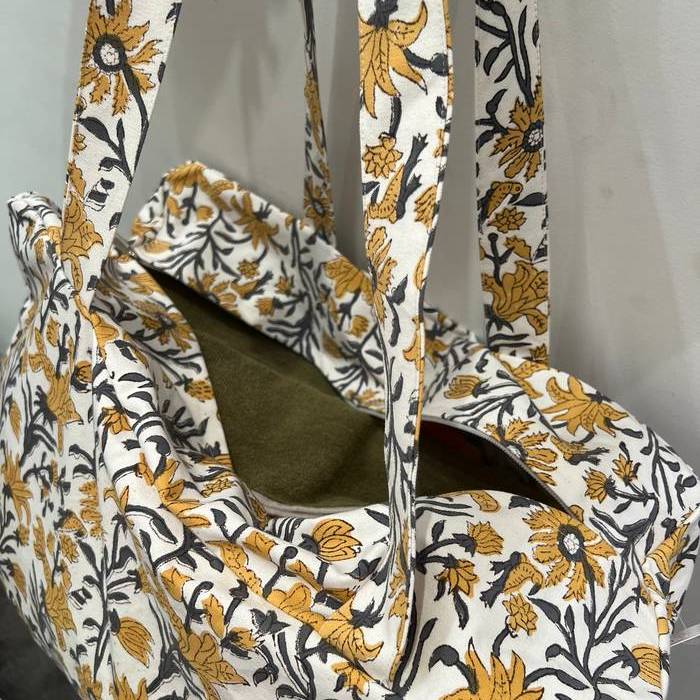 Bolso de algodón en colores alegres, con bonito estampado de fondo blanco con flores amarillas y grises. Cierre con cremallera. Gracias a su tejido natural es fácil de lavar. por su amplio tamaño tendrás la posibilidad de guardar tus toallas de playa, tú equipaje, incluso tus enseres de finde semana…