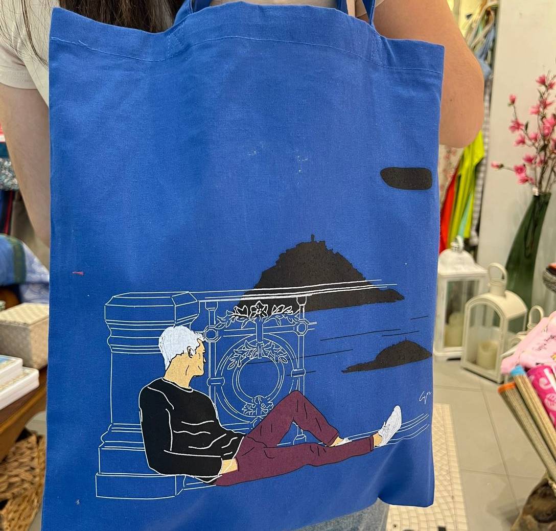 Bolsa de tela/tote bag azul, unisex, tanto como para hombres y mujeres. Con motivo Donostiarra de la barandilla de la concha.