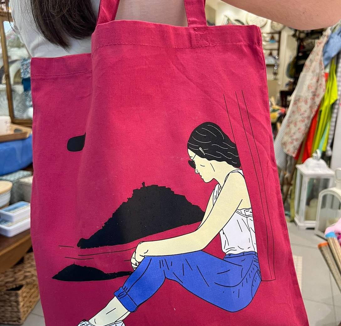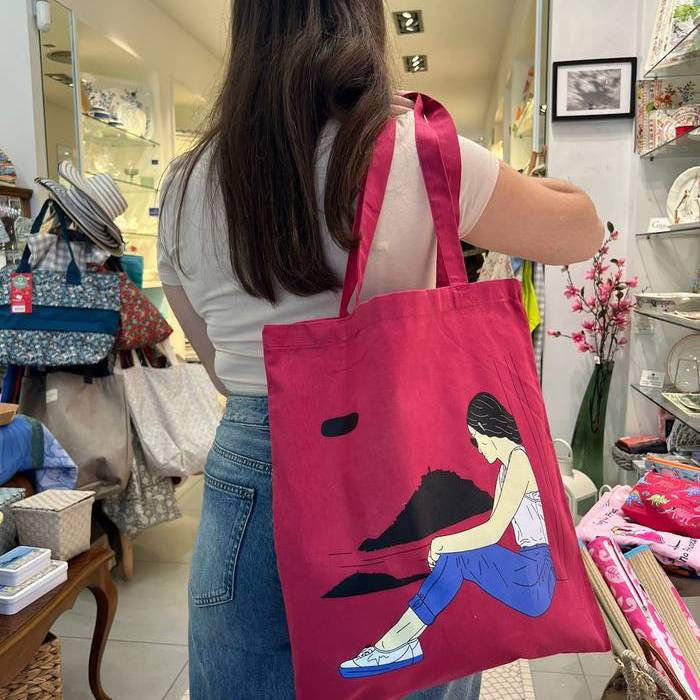 Bolsa de tela/tote bag magenta, unisex, tanto como para hombres y mujeres. Con motivo Donostiarra de la bahía.