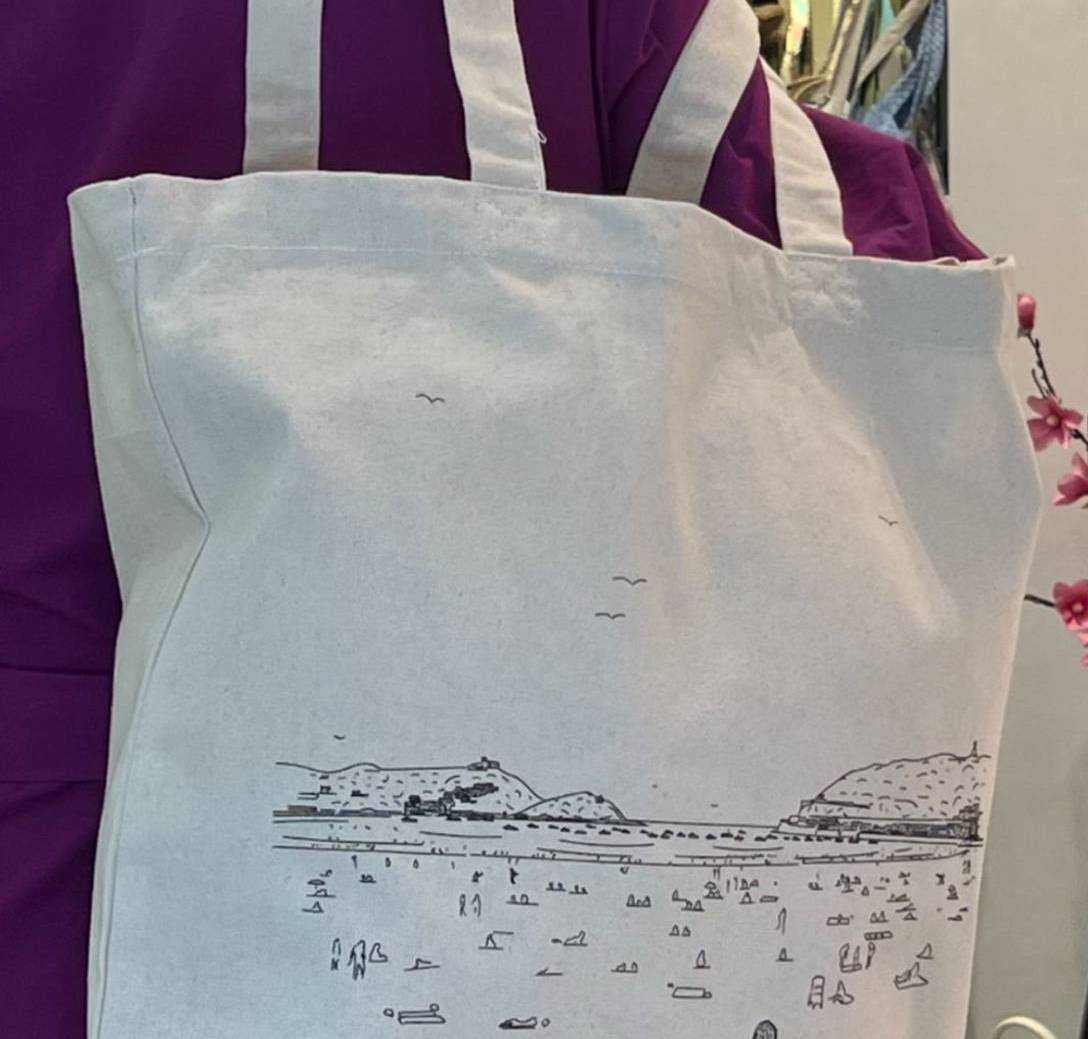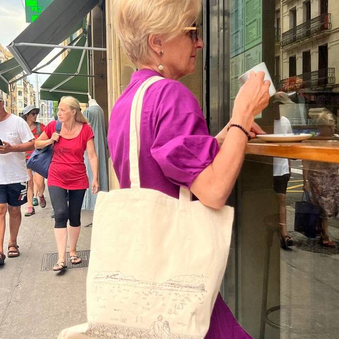 Bolsa de tela/tote bag en color crudo, unisex, tanto como para hombres y mujeres. Con motivo Donostiarra de una chica pareja observando la playa desde la barandilla de la concha. Estas tote bags son perfectas para utilizar el día a día, irse a la playa, dar un paseo…