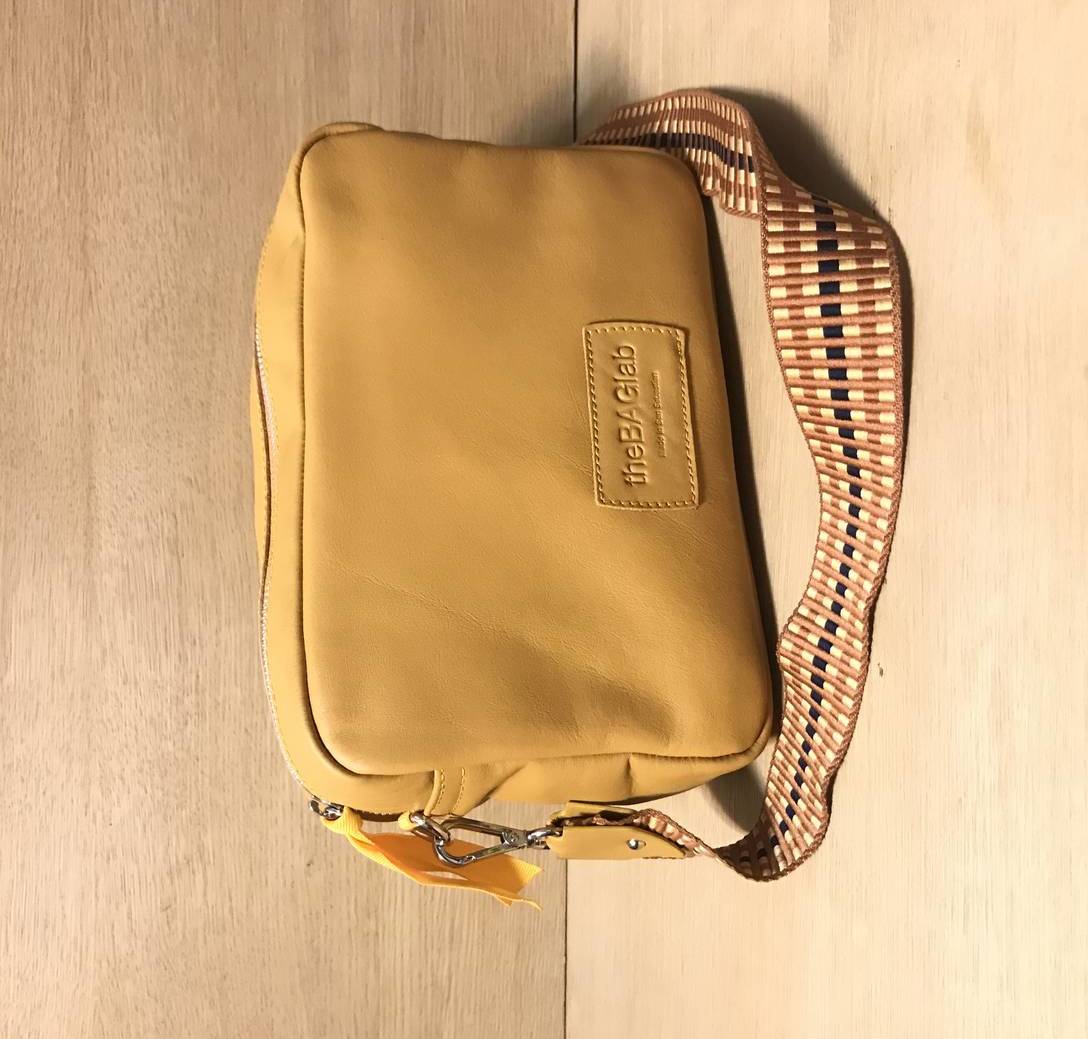 Bolso bandolera de piel vacuno con bolsillo frontal color mostaza. Cuenta con cierre de cremallera, bolsillo interior y tira bandolera bicolor con 2 mosquetones.