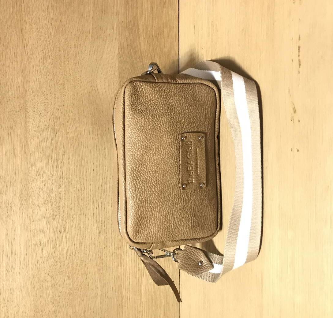 Bolso bandolera de piel vacuno color arena. Cuenta con cierre de cremallera, bolsillo interior y tira bandolera bicolor con 2 mosquetones.