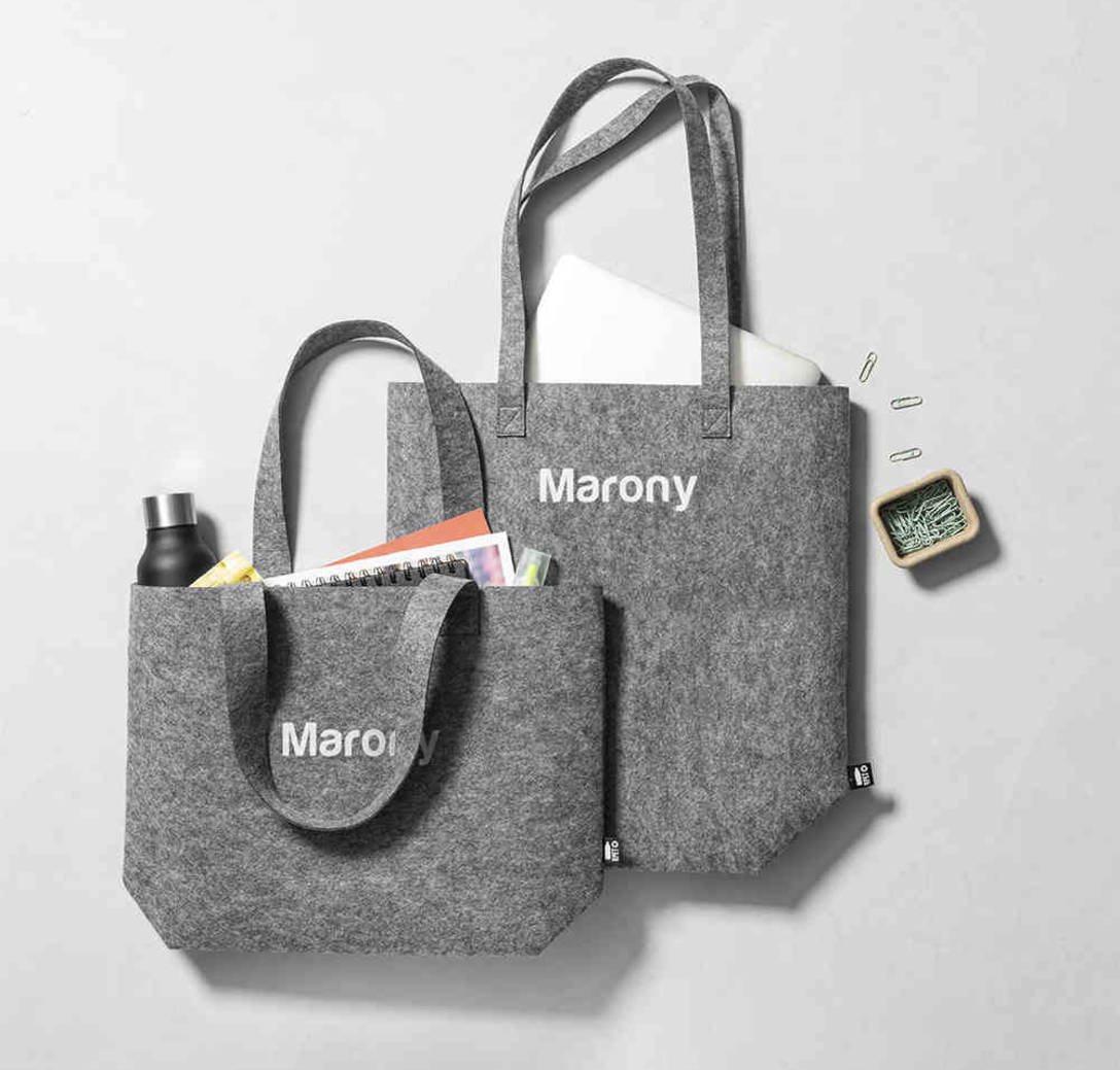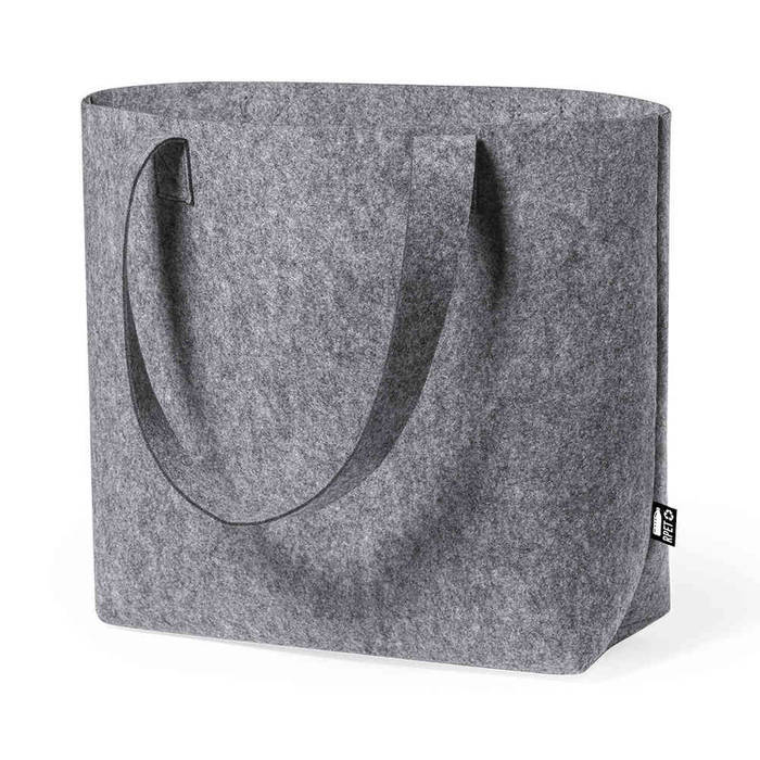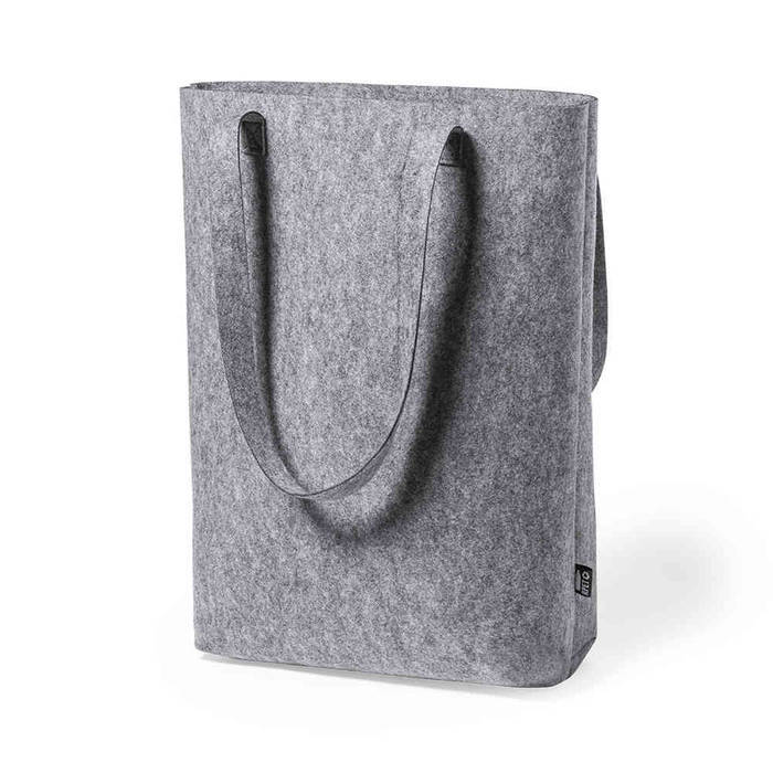 Bolso de línea nature y en resistente fieltro RPET reciclado, fruto de la combinación del proceso de reciclaje de materiales plásticos junto con la técnica milenaria de fabricación del fieltro, dando como resultado un material de eco-tendencia que, además de ser de origen reciclado, también se convierte en reciclable. Con fuelle en la base. Resistencia hasta 6kg, con distintivo RPET en etiqueta exterior.