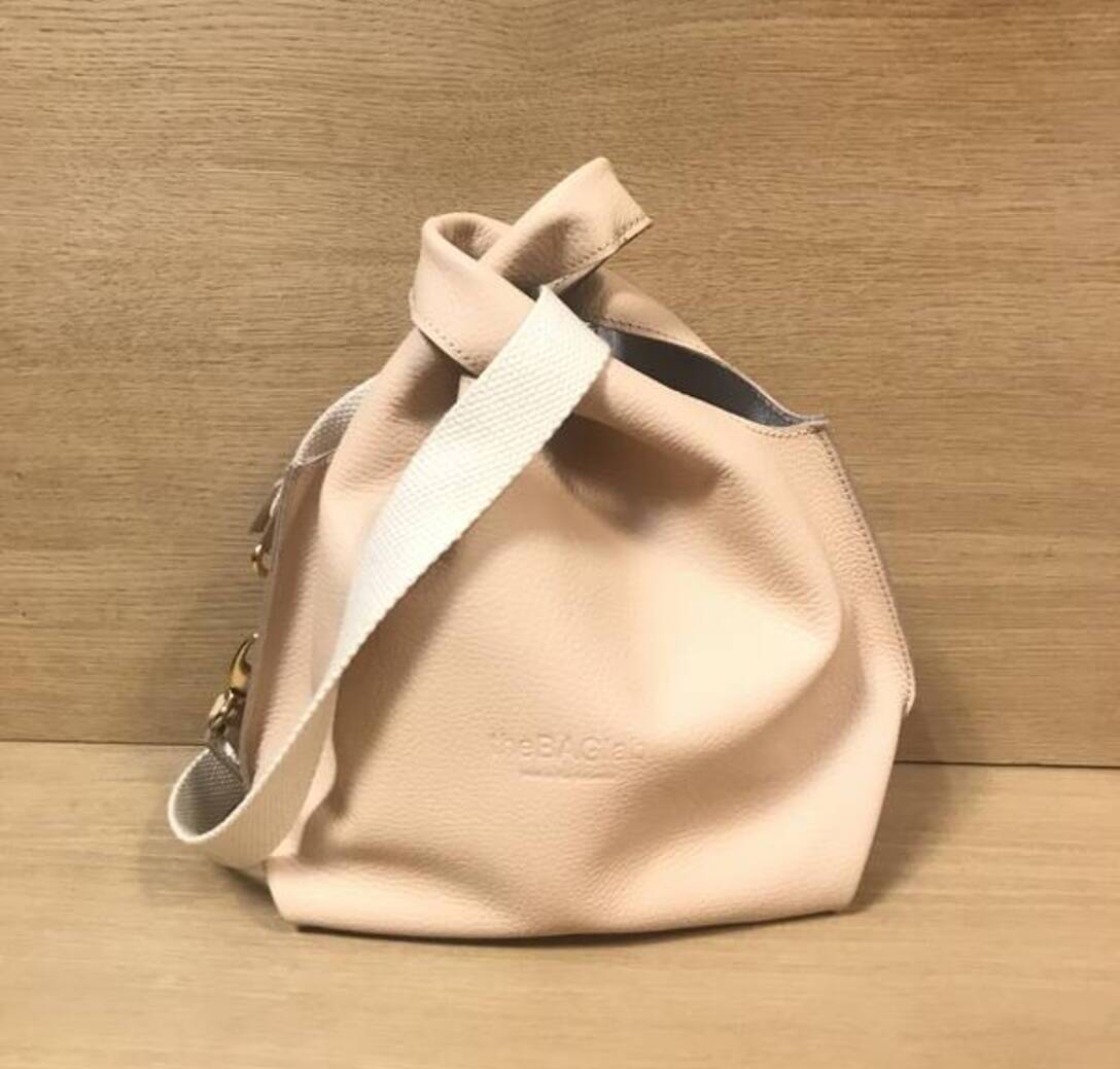 The Mini Julia Bag realizado en piel vacuno, color nude. Cuenta con broche de presión, bolsillo interior y tira bandolera bicolor con 2 mosquetones. Lo puedes colgado con la bandolera o de mano sin ella.
