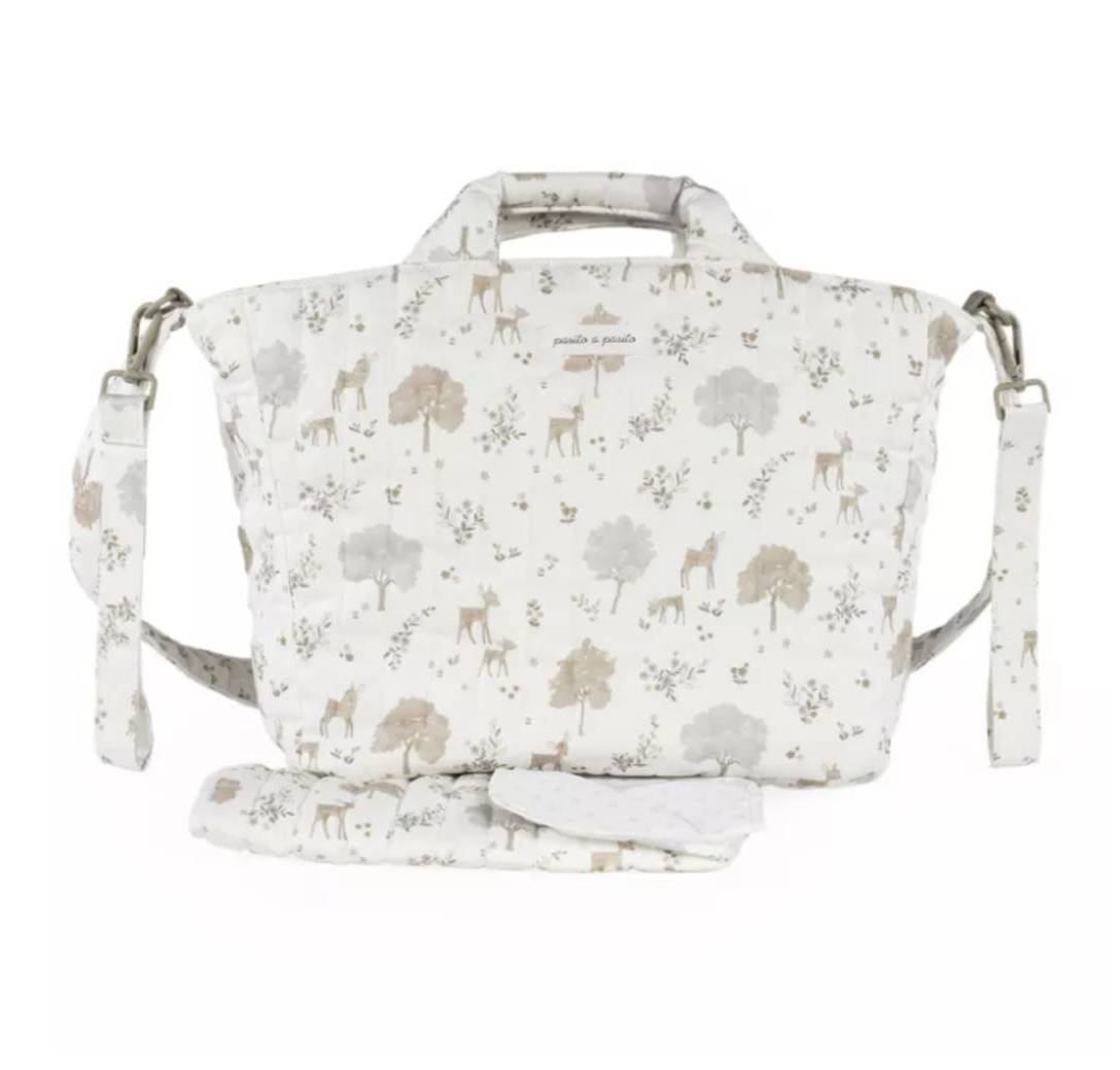 El Bolso para Carrito Nara de Pasito a Pasito es amplio, resistente al agua y muy completo. Con estampado de ciervos en tonos neutros, incluye doble asa, cambiador, bolsillo térmico y compartimentos organizadores. Fabricado en 100% algodón con tratamiento waterproof. Ideal para llevar todo lo del bebé… ¡y lo tuyo también!