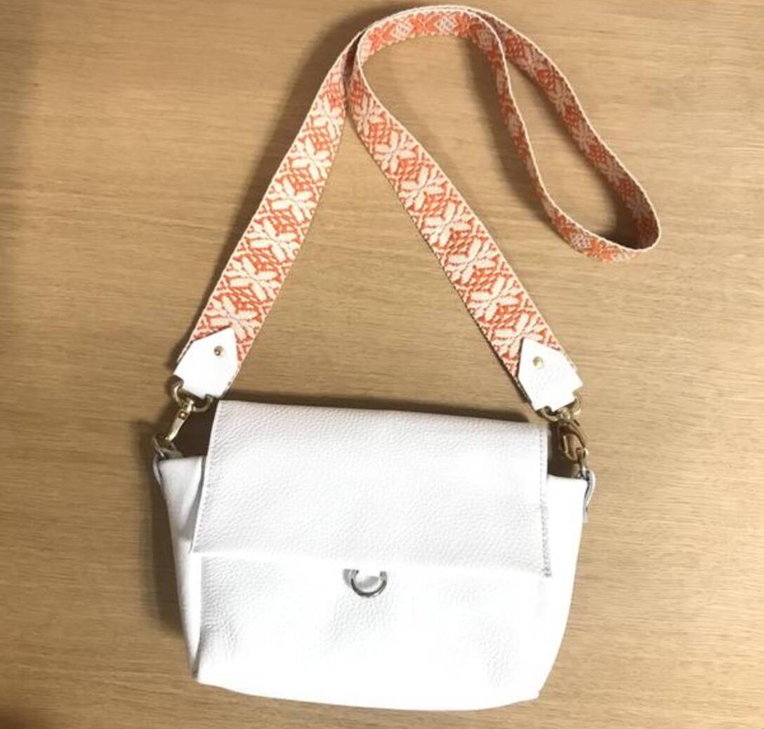 Bolso con solapa de piel vacuno color blanco. Cuenta con cierre de imán, bolsillo interior y tira bandolera bicolor con 2 mosquetones.
