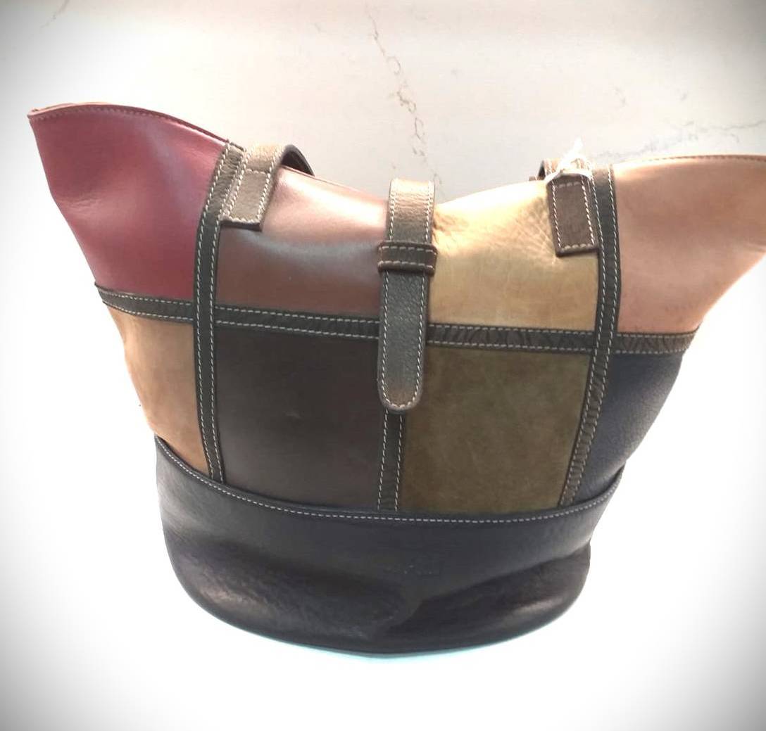 BOLSO DE SEÑORA MARRON OSCURO Y DETALLES CUADRADOS DE VARIOS COLORES. TODO ELLO 100% PIEL DE VACUNO CON DOS ASAS `PARA LLEVAR EN EL HOMBRO