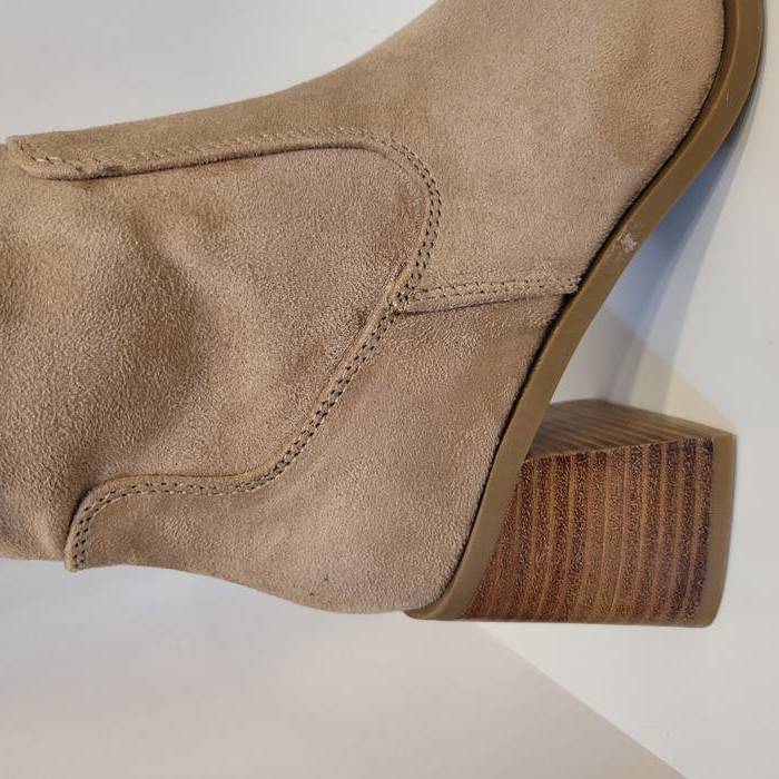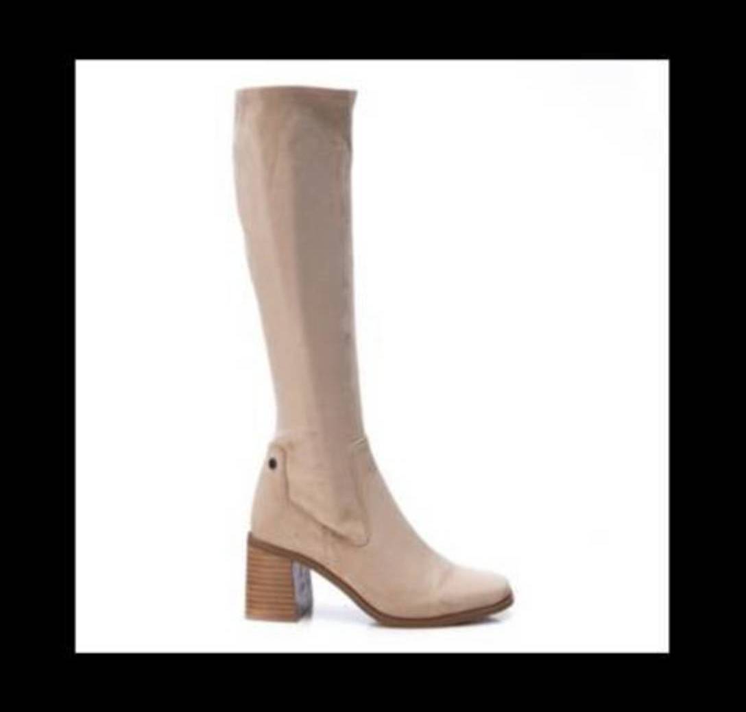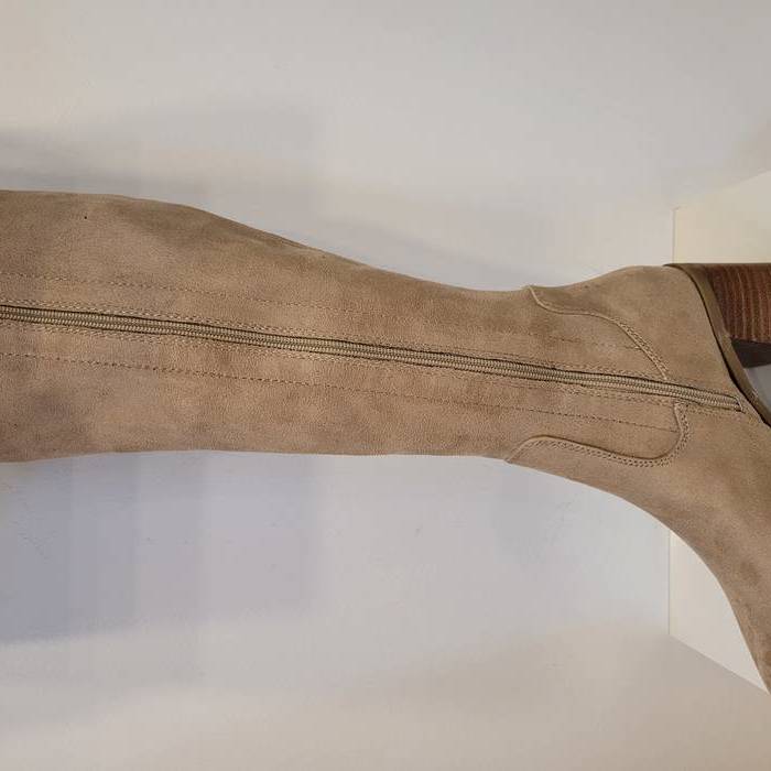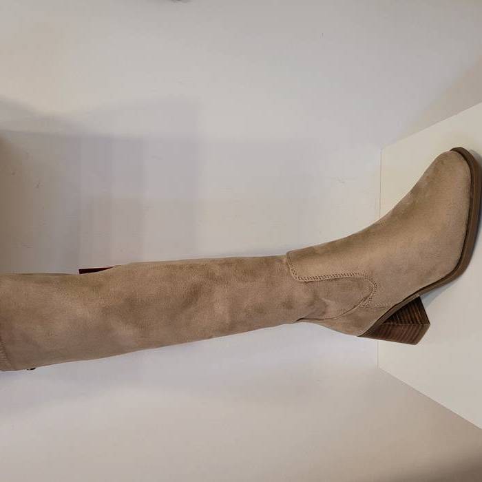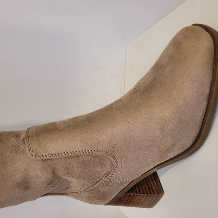 Bota alta en antelina color camel. Estilosa y cómoda perfecta para vestidos y faldas. Cierre de cremallera.