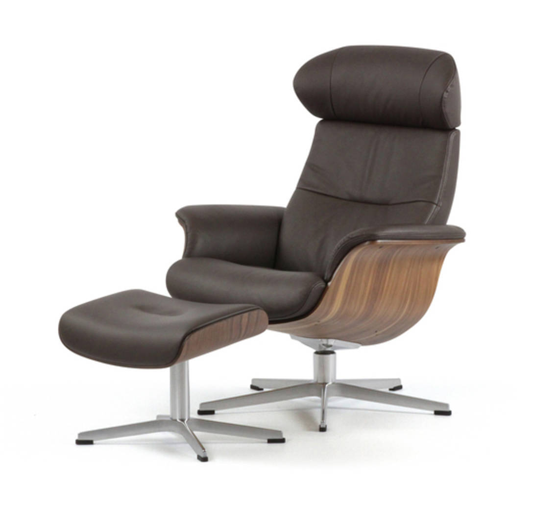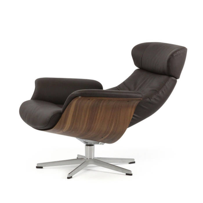Butaca reclinable y giratoria con base de acero inoxidable, estructura de madera de color nogal con forma redondeada y tapicería en cuero.