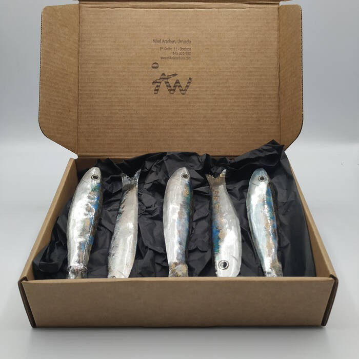 Grupo de 5 sardinas de metal reciclado para decoración de pared. Ideal para hacer un regalo original y sostenible.