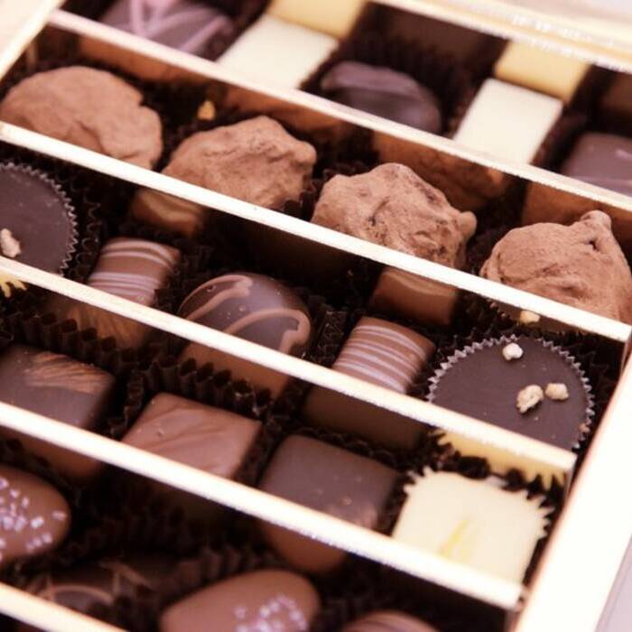 Bombones de diferentes sabores: praliné, chocolate negro, café, naranja, chantilly, menta, frambuesa, galleta...