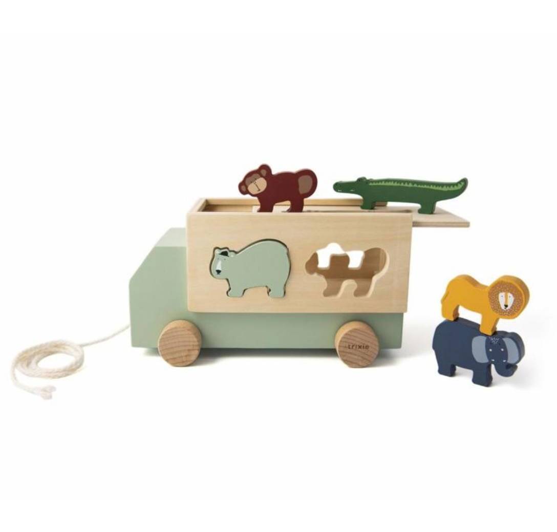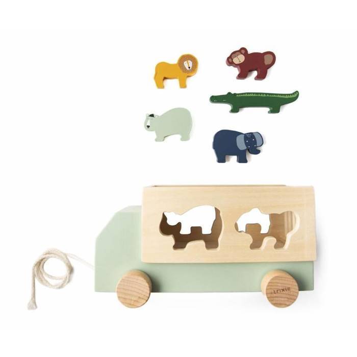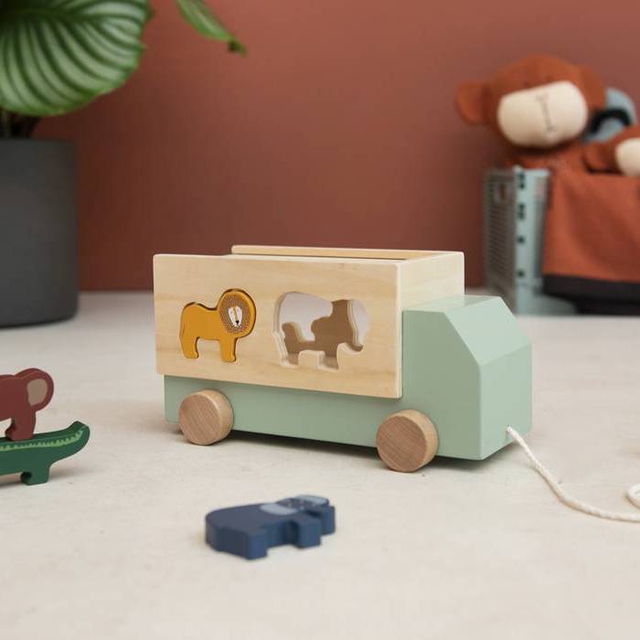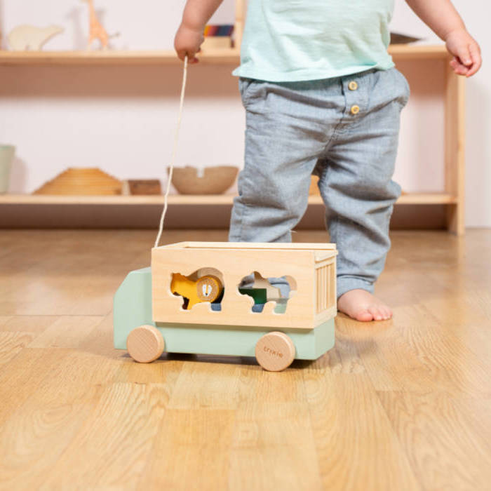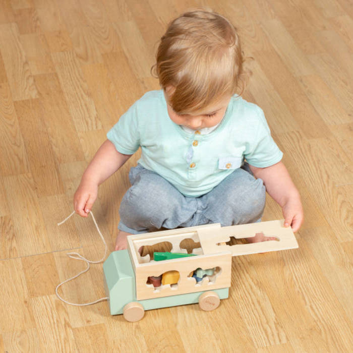 Un juego de encaje de madera, para que tu peque lleve a pasear a sus animales arrastrando el camión. Perfecto para desarrollar la motricidad fina.