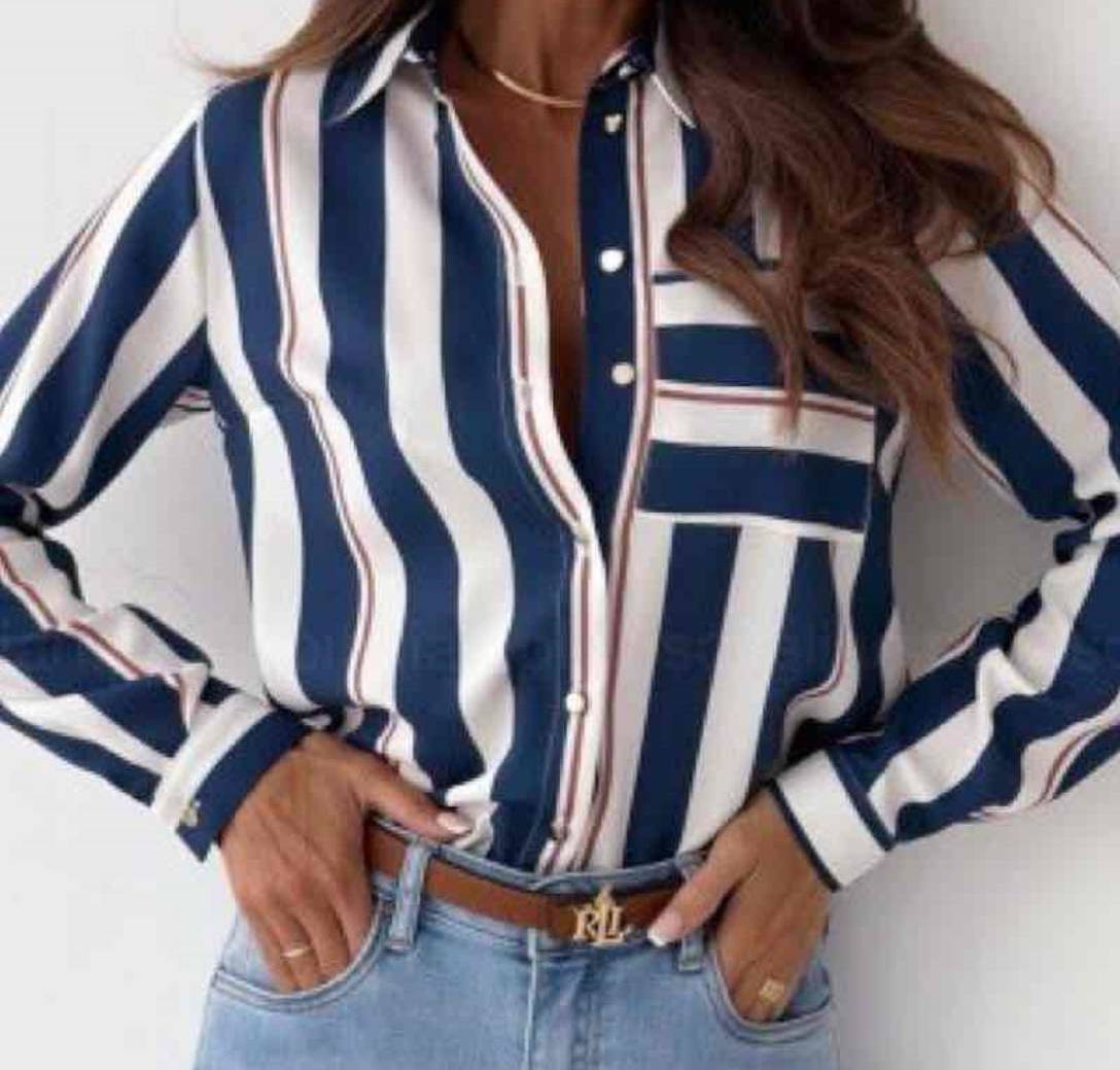 Elegante blusa en poliéster con elegantes rayas en crudo y marino.