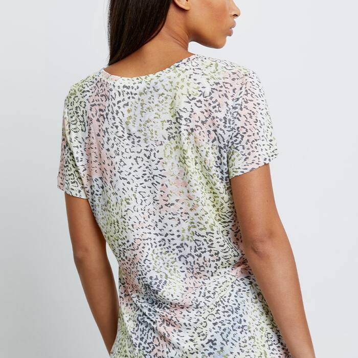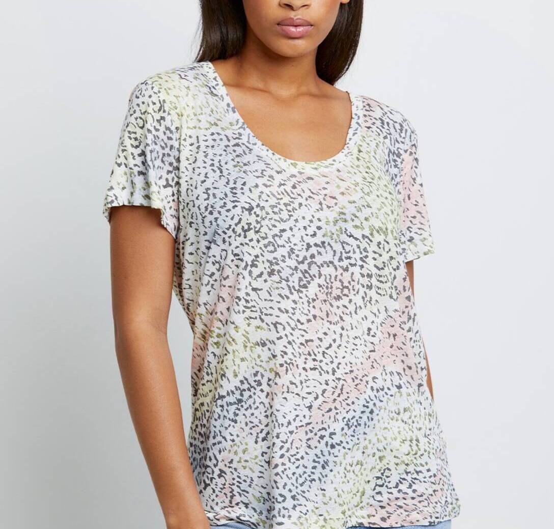 Camiseta de rayón de lino, manga corta, camiseta con cuello redondo de color marfil suave con diseño de teñido anudado multicolor y estampado de guepardo negro en toda la prenda y corte holgado. Súper liviana y favorecedora, esta camiseta es perfecta para el uso diario.