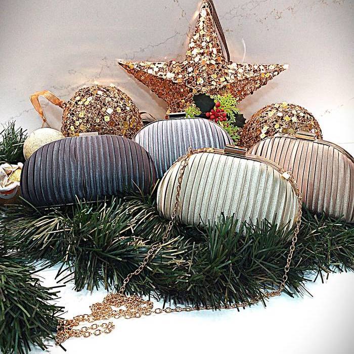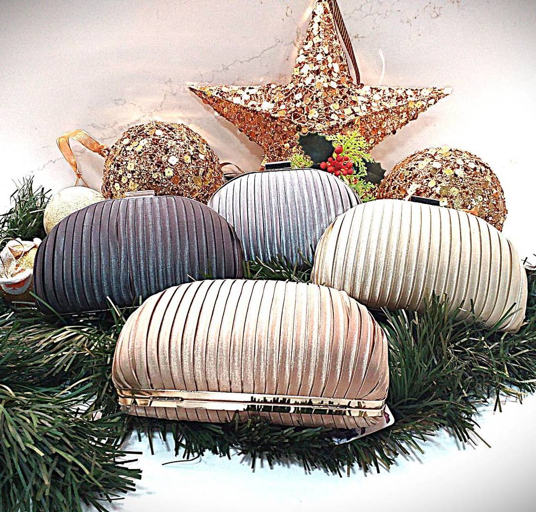 De forma oblonga o abovedada,se sostiene con la mano. El material exterior es de satén, con pliegues verticales. Tiene un cierre de broche de metal en la parte superior.