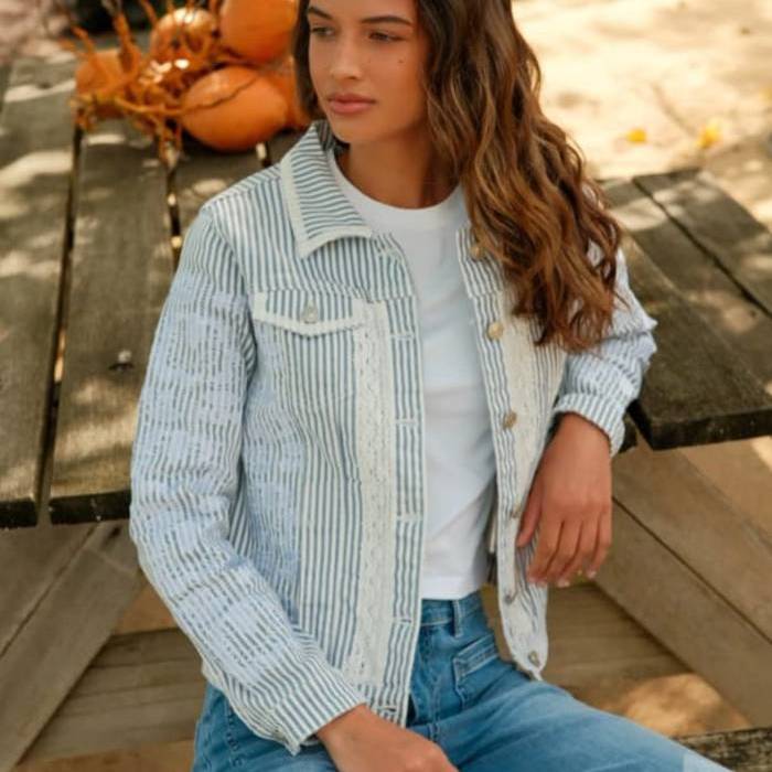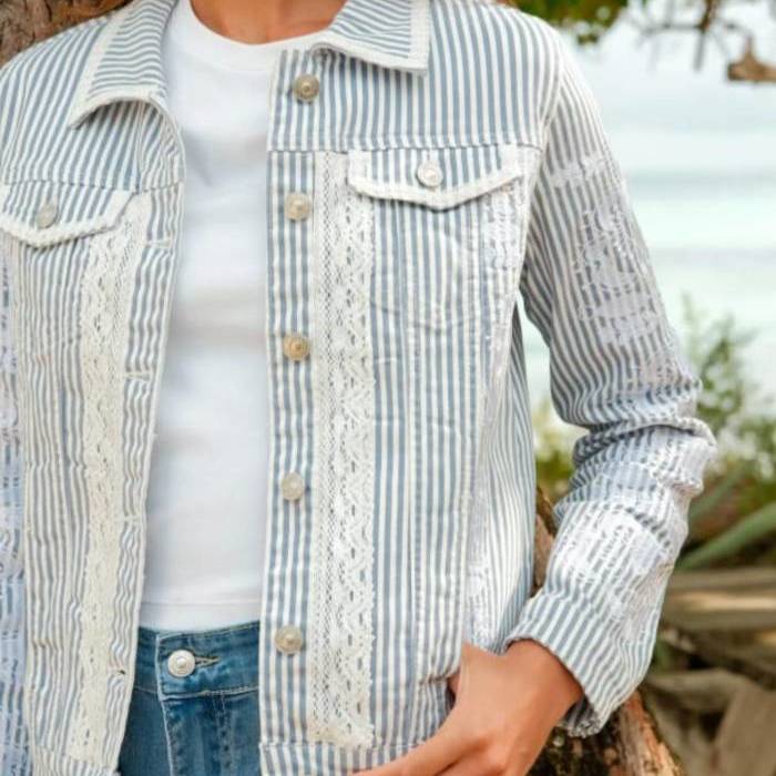 Cazadora de curte vaquero en algodón.Tejido de rayas en azul y blanco con aplicaciones de puntilla y bordados en la pechera y las mangas .