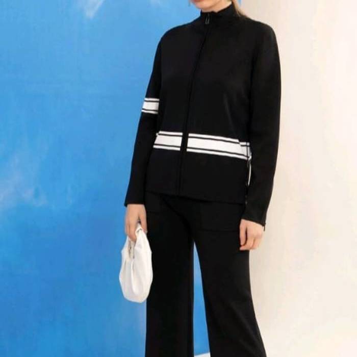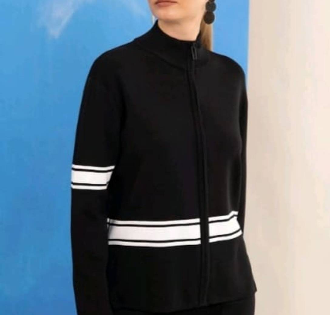 Chaqueta de punto roma fondo negro con detalle central de ralla ancha blanca . Cremalleras laterales y en la manga .