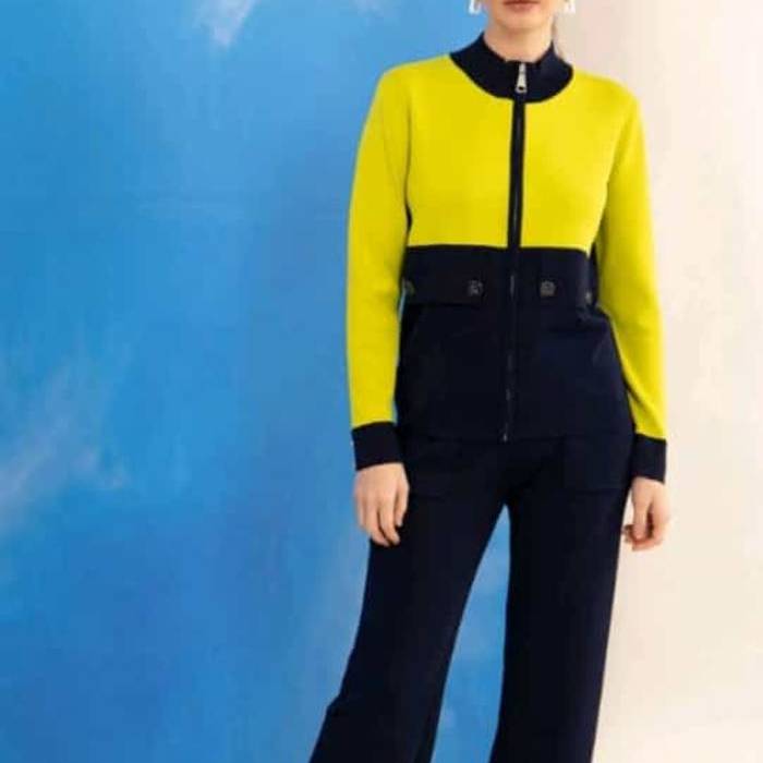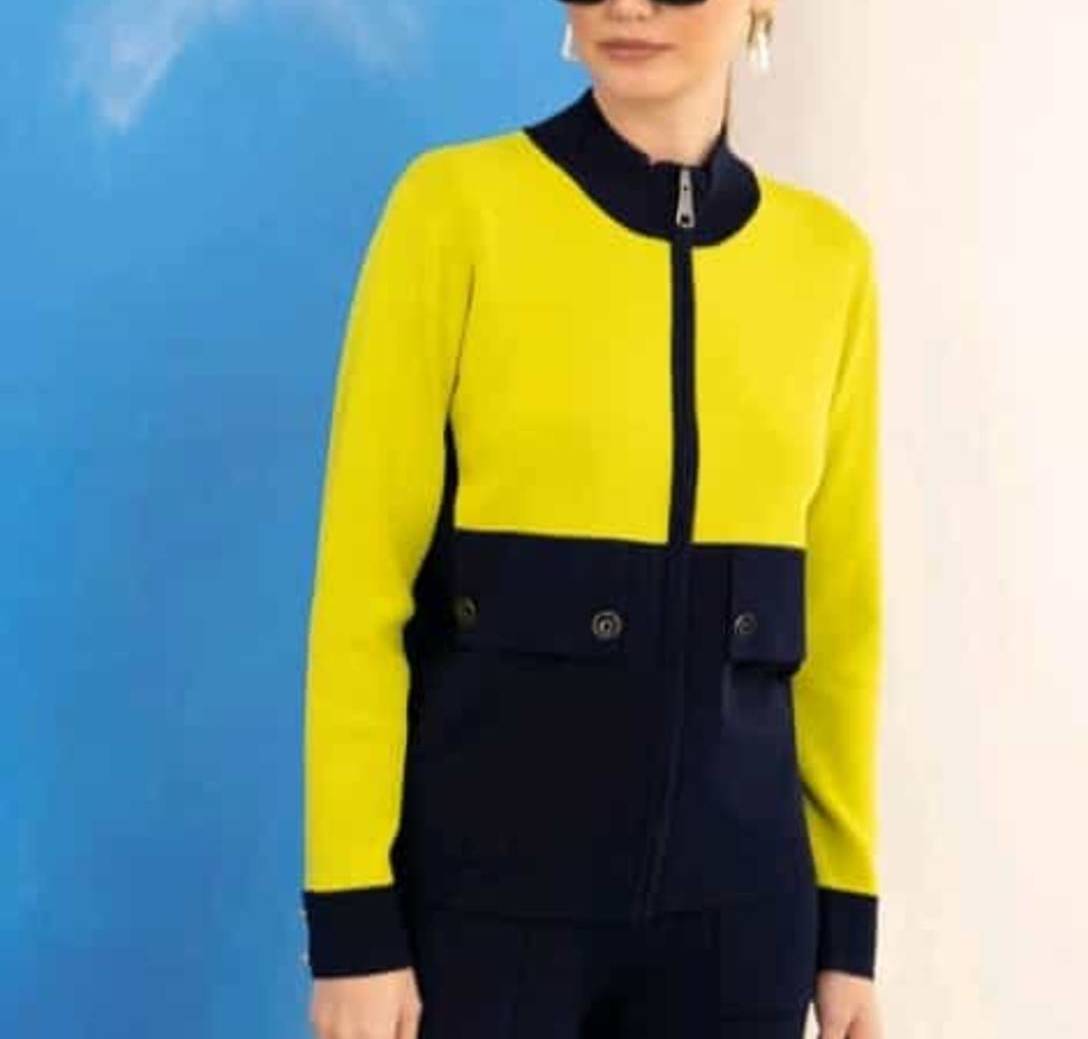 Chaqueta punto roma bicolor marino / pistacho , tapetas de bolsillo decorativas con botones personalizados . Manga larga con puño boton tipo blusa.