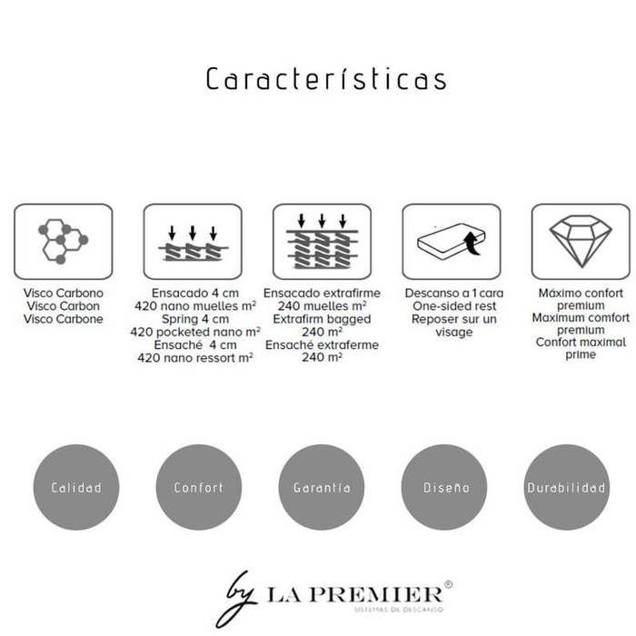 Colchón de muelles ensacados independientes, con manta de nano muelles ensacados independientes de 4cm. y viscoelástica de carbono en la cara superior.