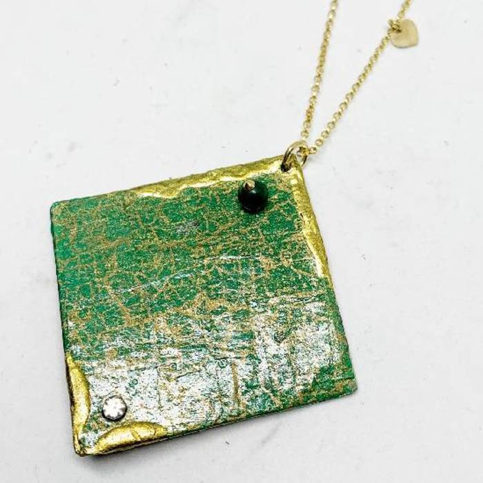 Collar con colgante en papel color verde, pintado a mano con piedra de jade y cadena de plata bañada oro.