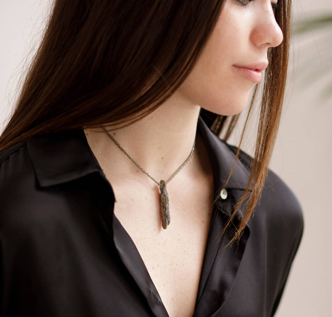 Si eres amante de los minerales y las piedras, este es tu collar, realizado con cianita en roca y espinela gris.