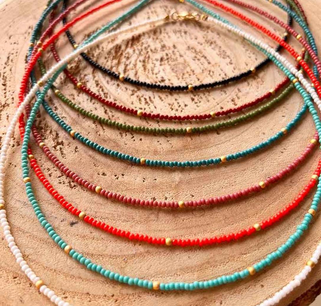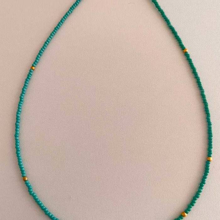 Collar de rocalla con cuentas doradas, en color azúl turquesa de 40 cm de largo con extensión.