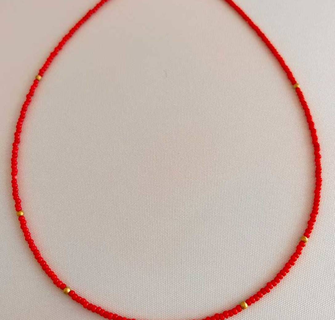 Collar de rocalla con cuentas doradas, en color coral de 40 cm de largo con extensión.