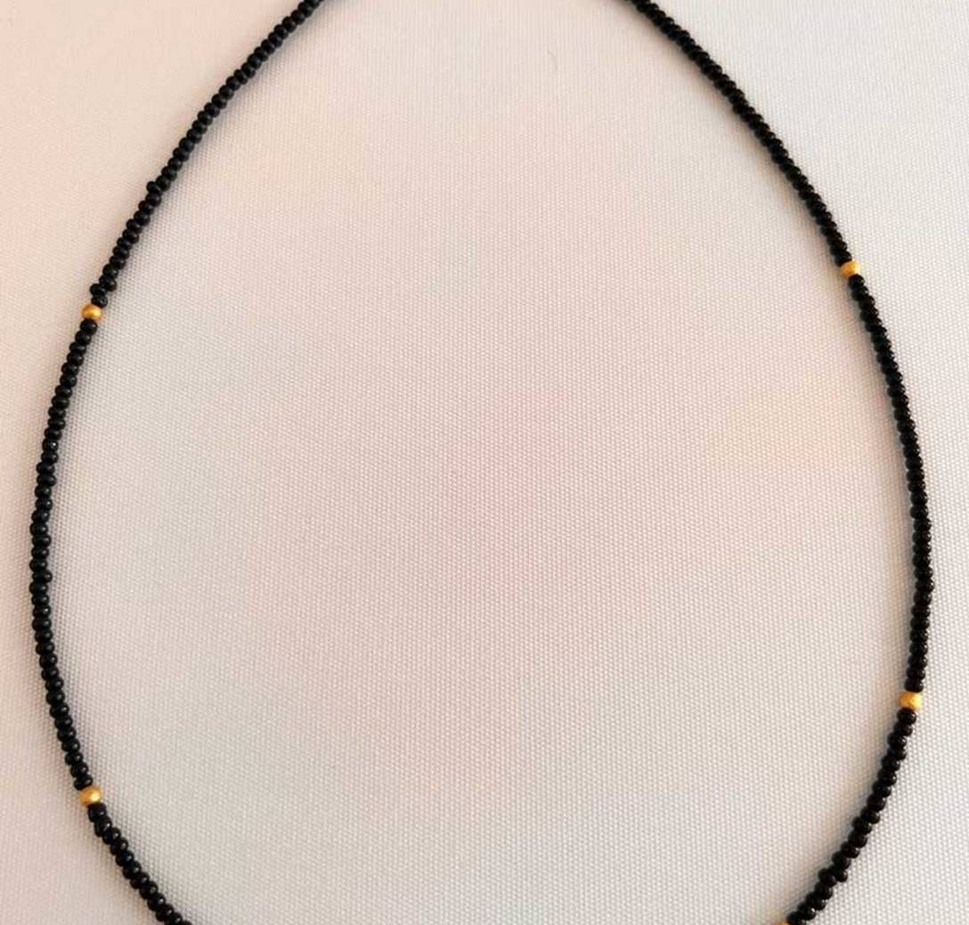 Collar de rocalla con cuentas doradas, en color negro de 40 cm de largo con extensión.