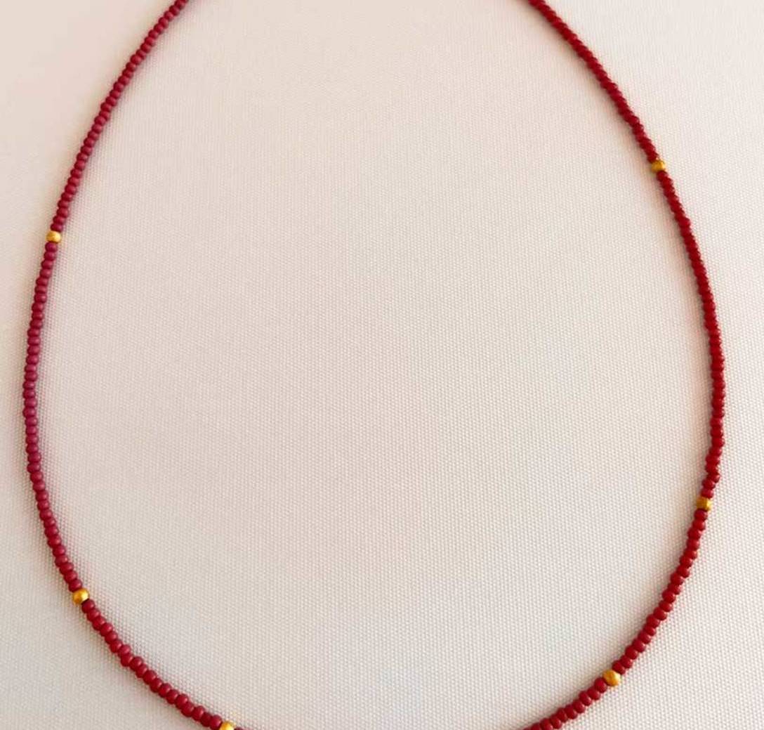 Collar de rocalla con cuentas doradas, en color rosa oscuro de 40 cm de largo con extensión.