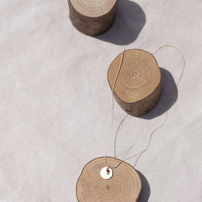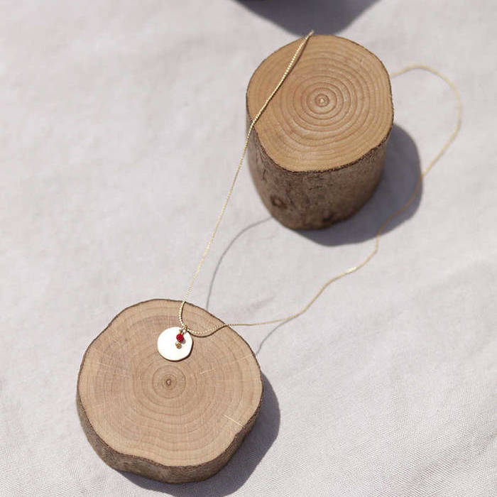 Latón chapado en oro mate y cristal rojo. Collar oro chapa de 12mm oro mate y bolita cristal rojo 2mm, cadena sencilla 0,7mm chapada en oro y 37cm de largo, con extensión.
