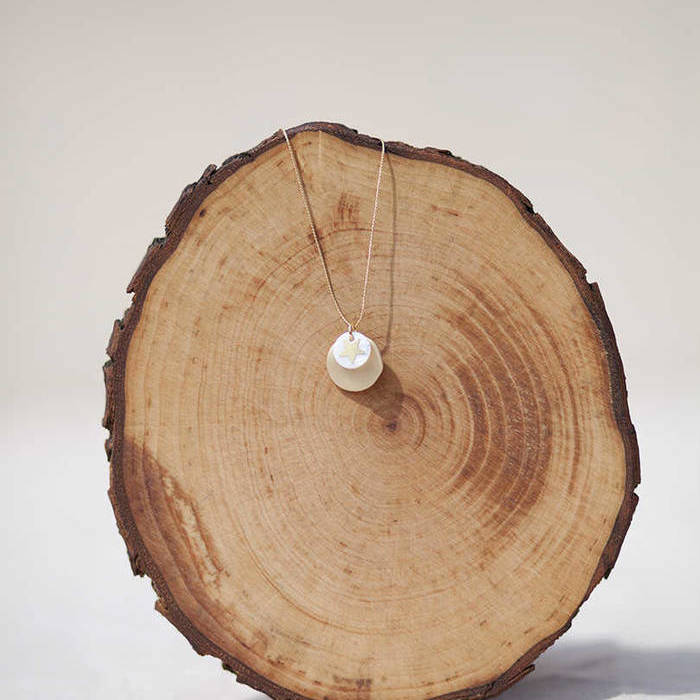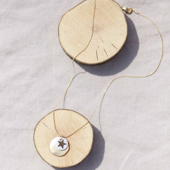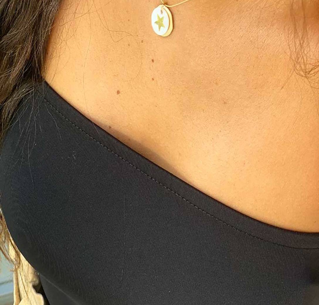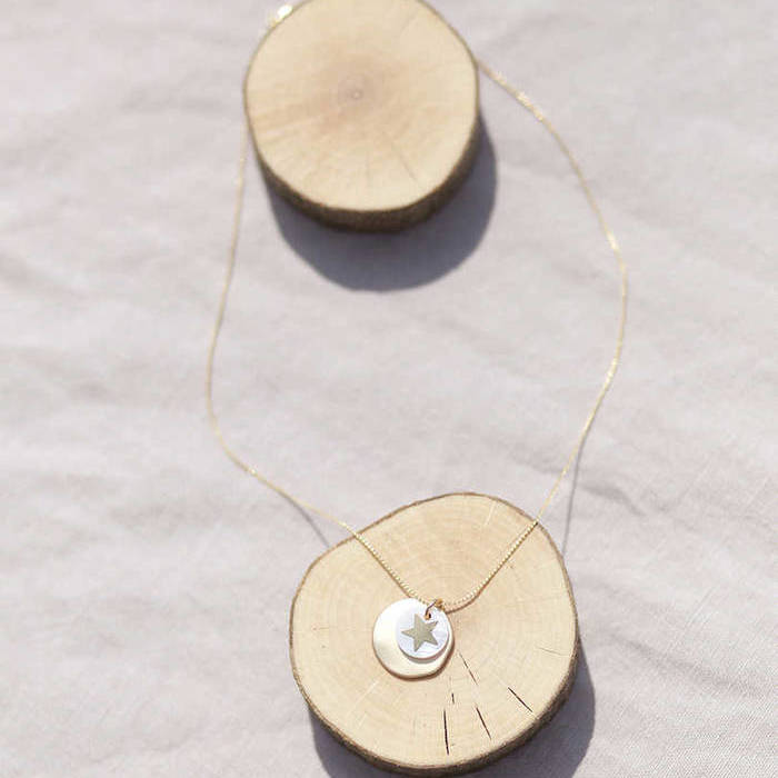 Latón chapado en oro mate y nácar. Collar oro chapa 25mm oro mate y estrella nácar 12mm, cadena sencilla 0,7mm chapada en oro de 37cm de largo, con extensión.