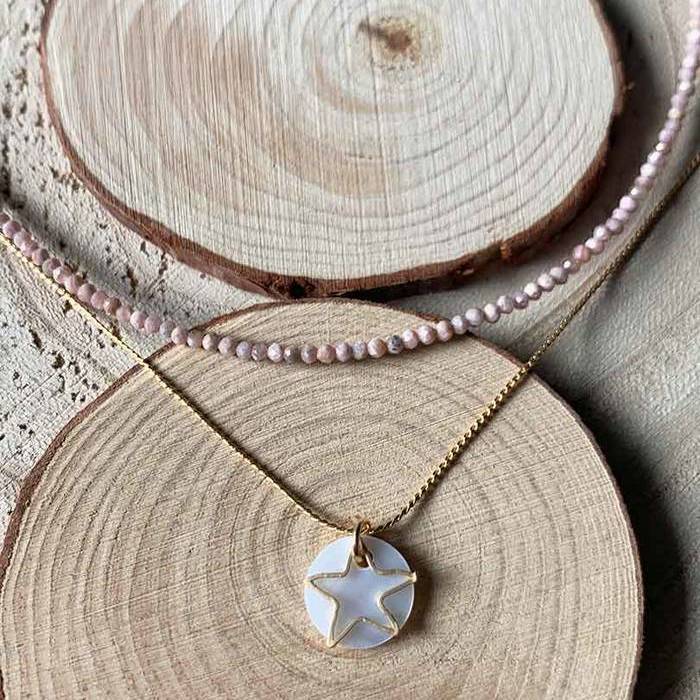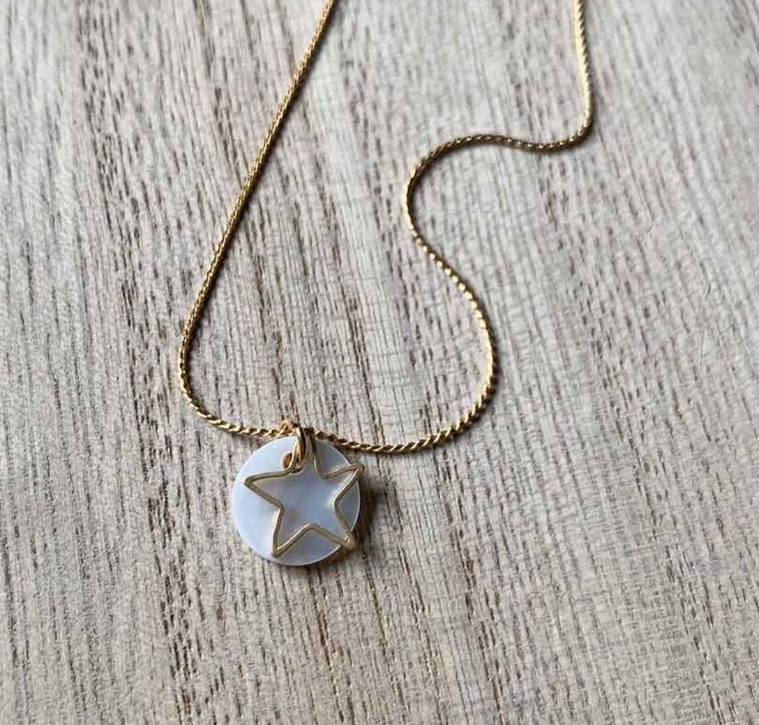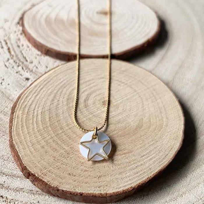 Latón chapado en oro mate y nácar. Collar oro chapa/nácar estrella/hueca de 9mm con cadena sencilla de 0,7mm y un largo de 37cm chapada en oro, con extensión para diferentes medidas.