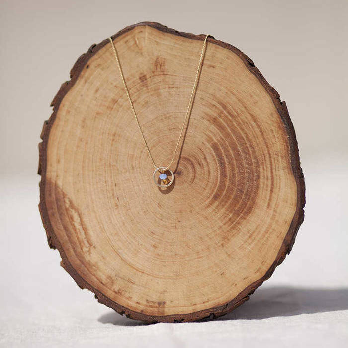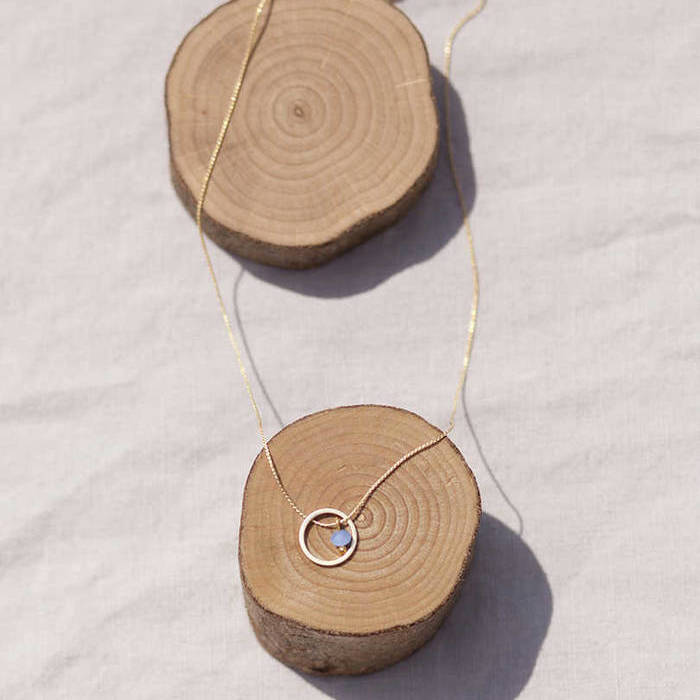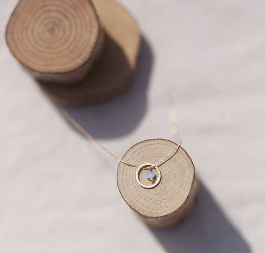 Latón chapado en oro mate y cristal azul. Collar oro circulo azul de 11mm en oro mate y detalle cristal azul 3mm oro, cadena sencilla 0,7mm chapada en oro y 37cm de largo, con extensión.