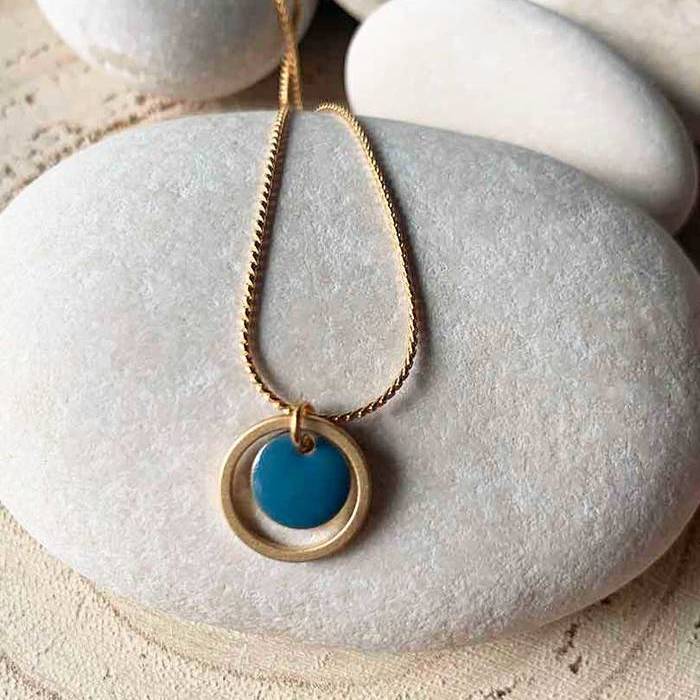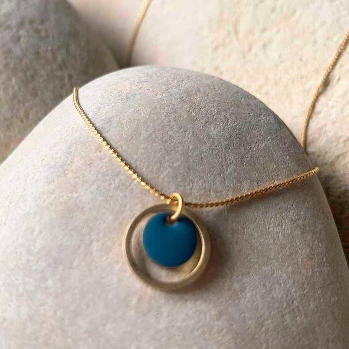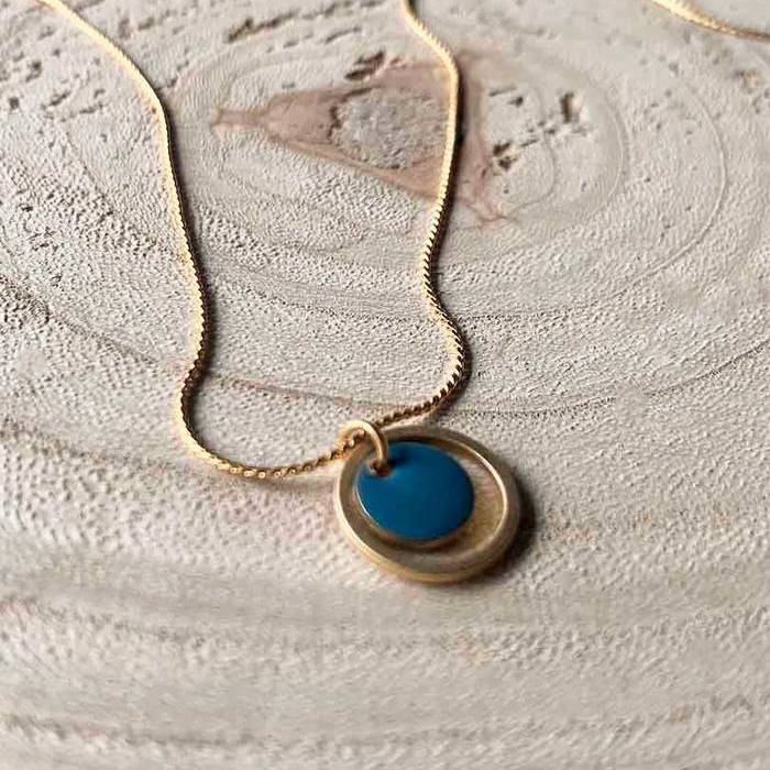 Latón chapado en oro y esmalte azul. Collar oro esfera esmaltada en azul, con círculo de 11mm y esfera esmaltada en azul de 8mm con cadena sencilla de 0,7mm chapada en oro con extensión.