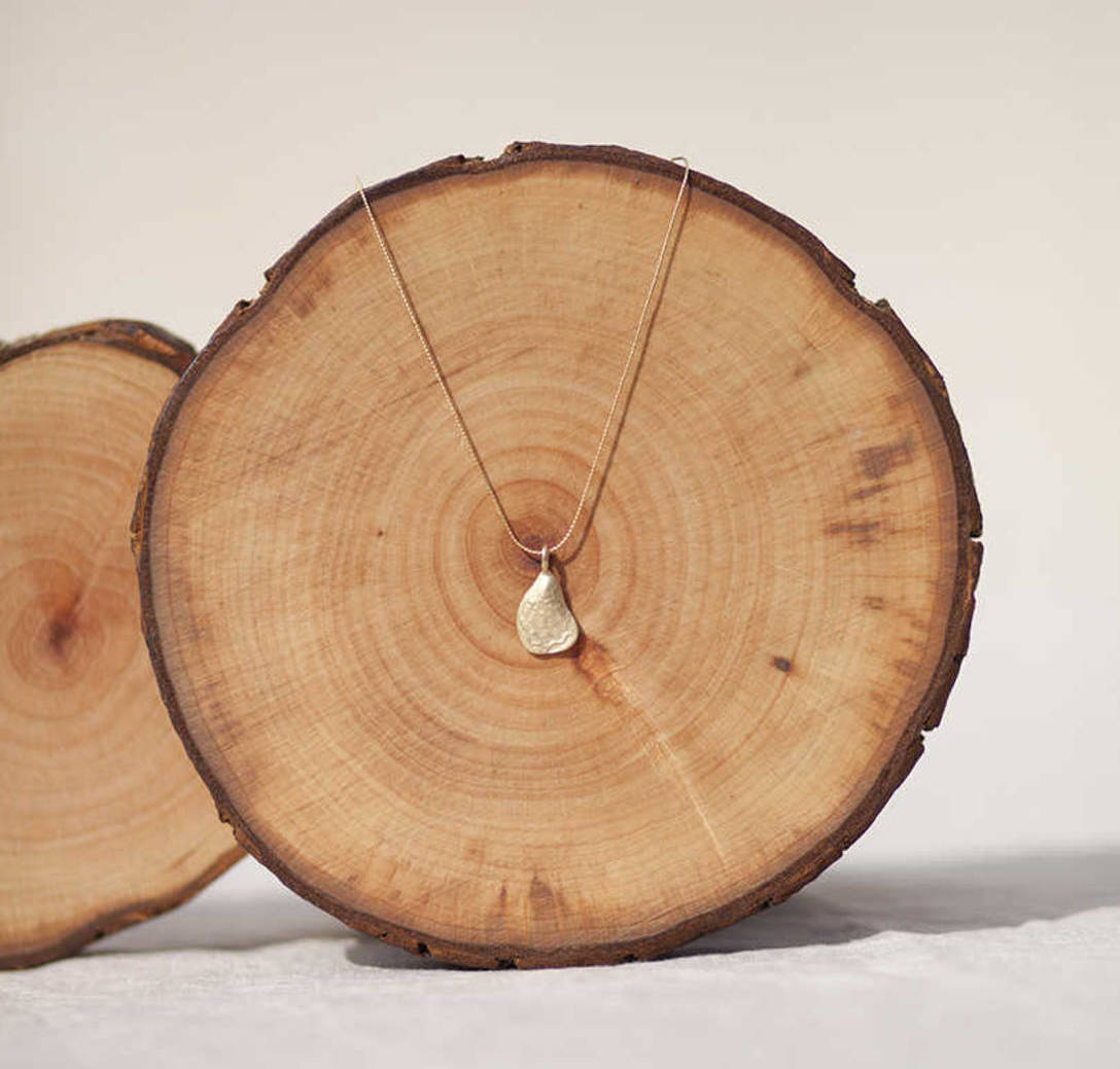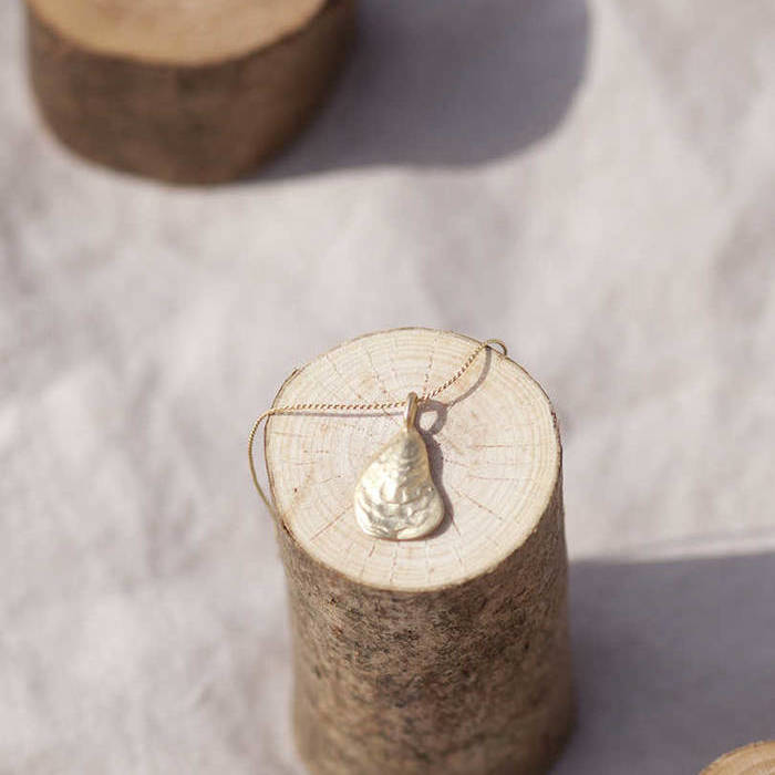 Latón chapado en oro mate. Collar oro concha lisa en oro mate con cadena sencilla de 0,7mm chapada en oro y 37cm de largo con extensión.