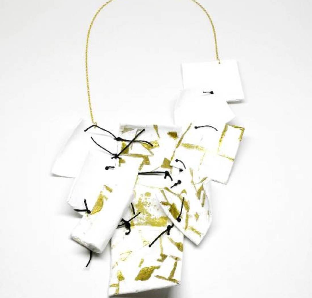 Collar realizado con celulosa, plasmada y pintada a mano. La cadena es de plata bañada oro.