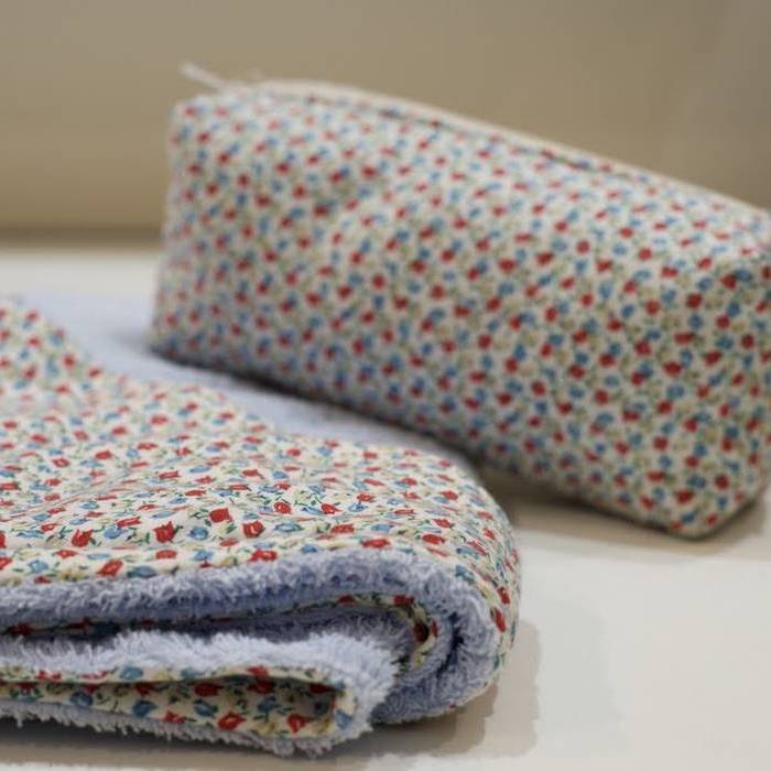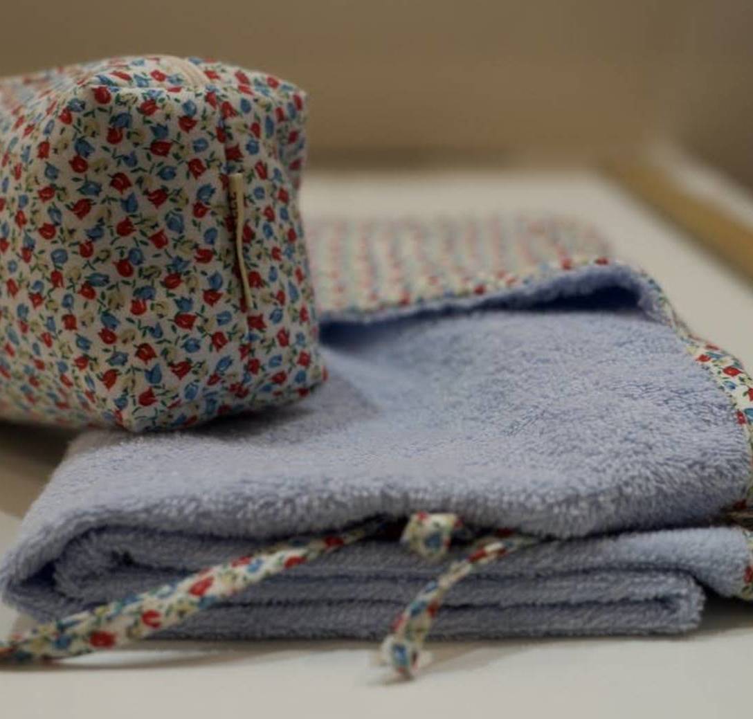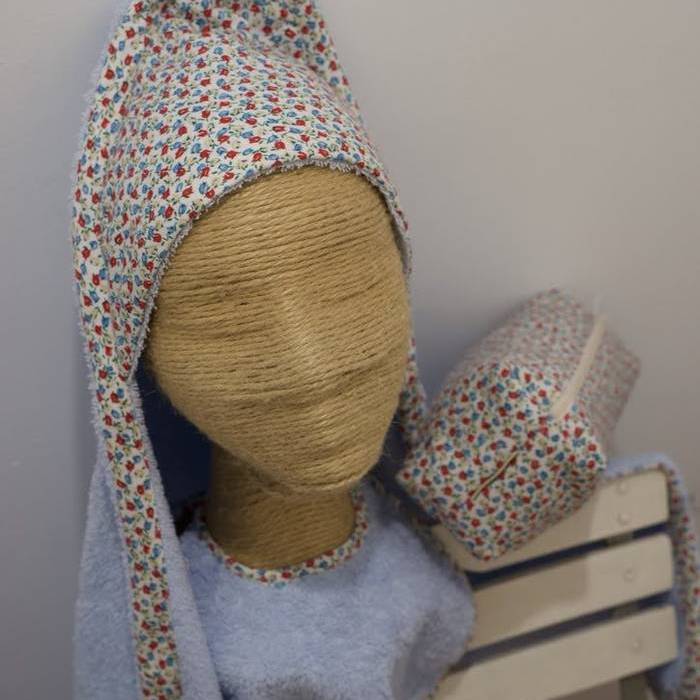Toalla 100% algodón con ribete estilo Liberty en tonos azules y esquina de capucha. La toalla de baño más cómoda y bonita para tu bebé. Incluye un neceser impermeable estilo Liberty en tonos azules a juego para guardar cepillo, colonia... Confeccionado en nuestro taller.