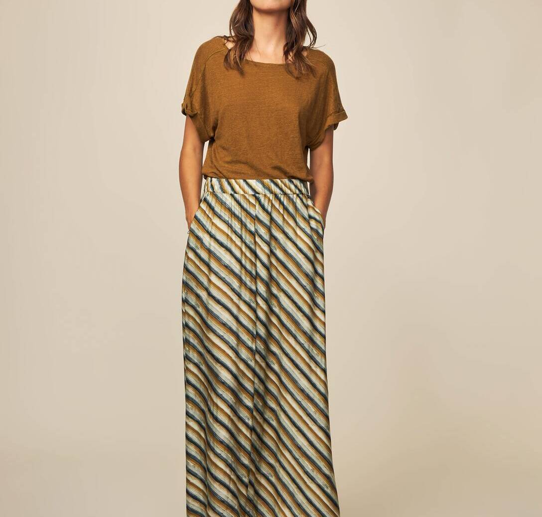 Falda de estilo informal, ligera y vaporosa. Perfecta para combinar con tus camperas, sandalias o deportivas. Confeccionada con 80% de viscosa y 20% de seda apenas la sentirás. Dale un toque especial a tu look.