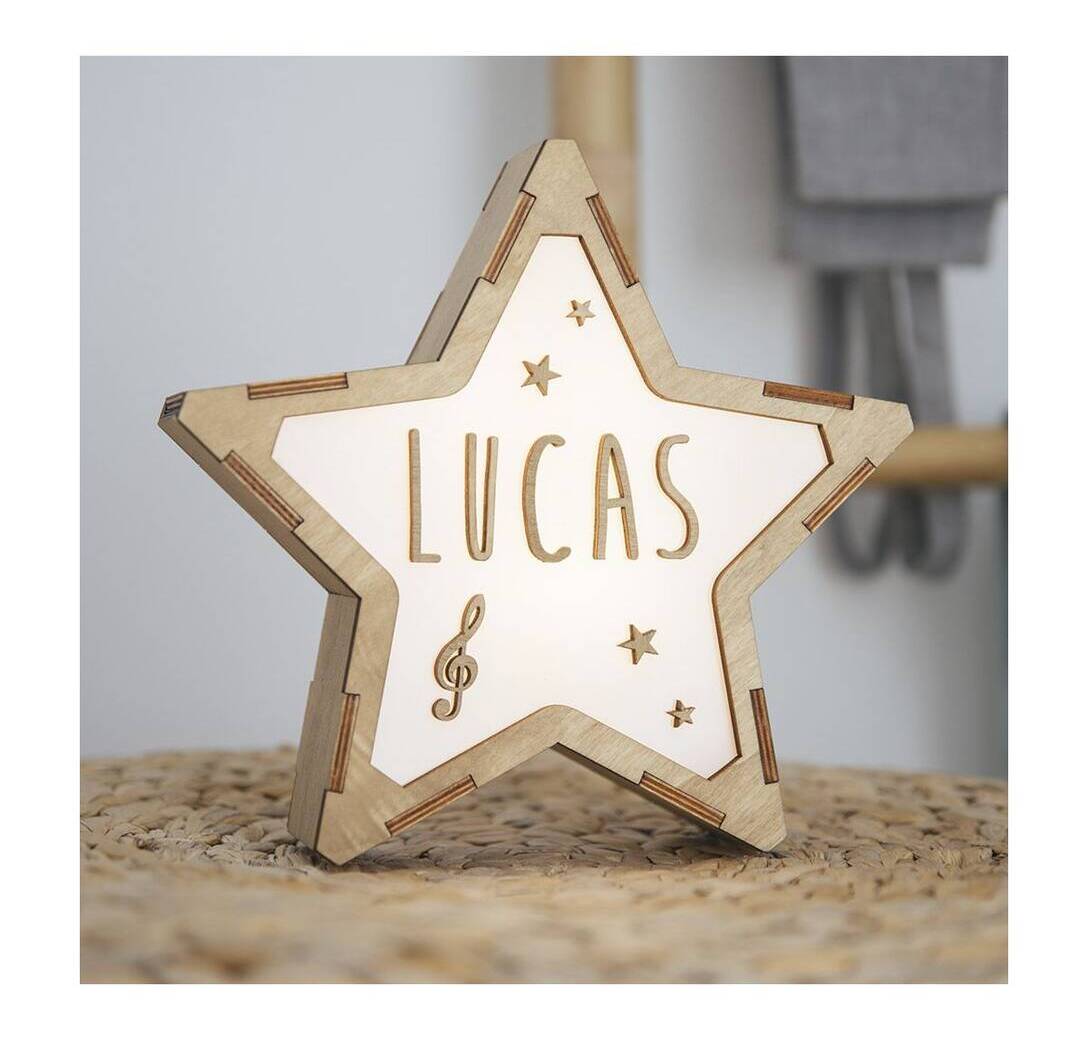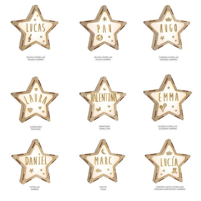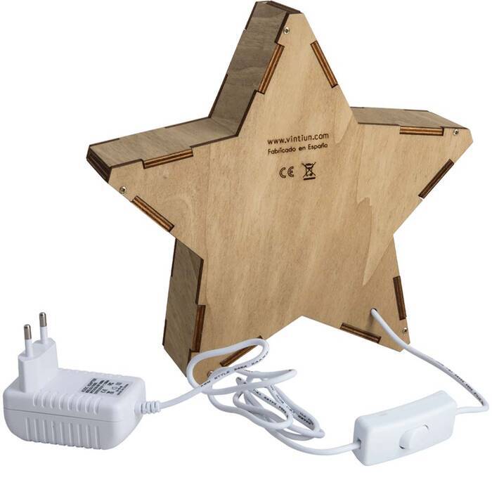 Lámpara LED con forma de estrella, realizada con maderas de bosque sostenibles a mano.