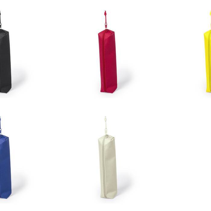 Estuche en resistente poliéster 600D en variada gama de vivos colores. Con cierre de cremallera y tirador a juego para fácil apertura.