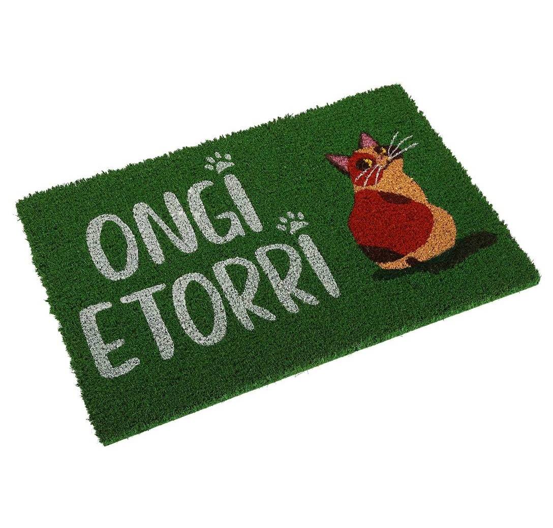 Este felpudo verde con la frase "Ongi Etorri" y un simpático gato es ideal para dar una cálida y acogedora bienvenida a tu hogar.