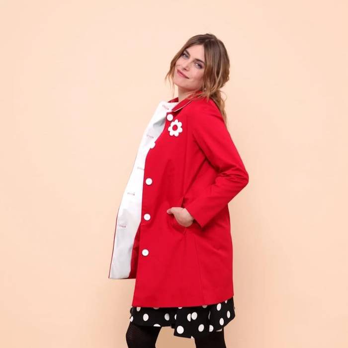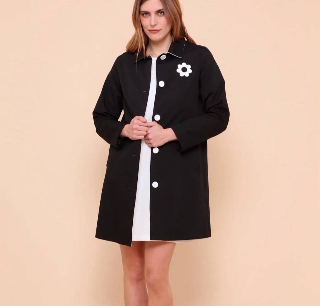 Gabardina de algodon , forrada . Detalles en vinilo blanco. Botonadura blanca . Corte en forma de A .