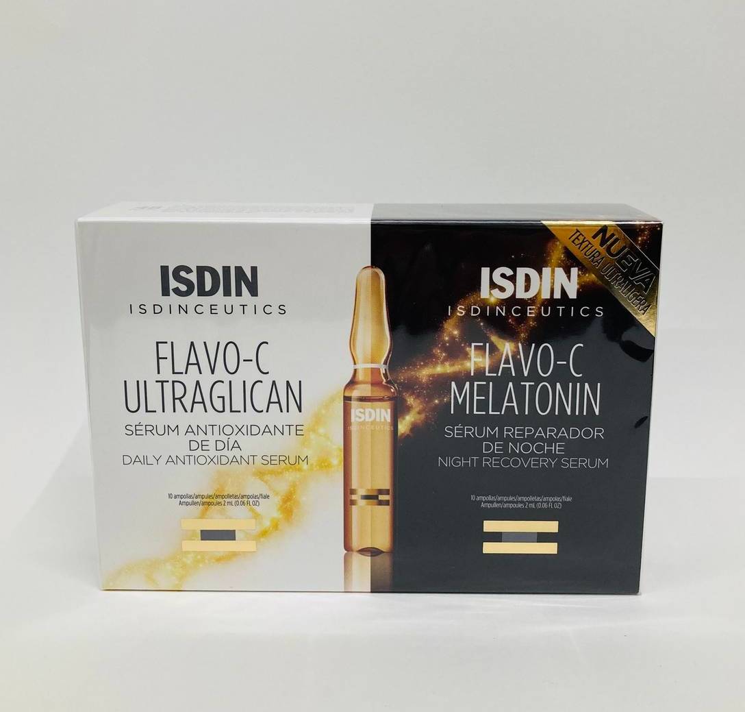 La rutina Day&Night Antioxidante combina el sérum antioxidante de día Flavo-C Ultraglican, que ayuda a proteger la piel de las agresiones que recibe durante el día a la vez que aporta luminosidad e hidratación, con el sérum reparador de noche Flavo-C Melatonin, que ayuda a recuperar la piel dejándola preparada para el día siguiente y aportando una potente acción antiaging. 10 + 10 ampollas.